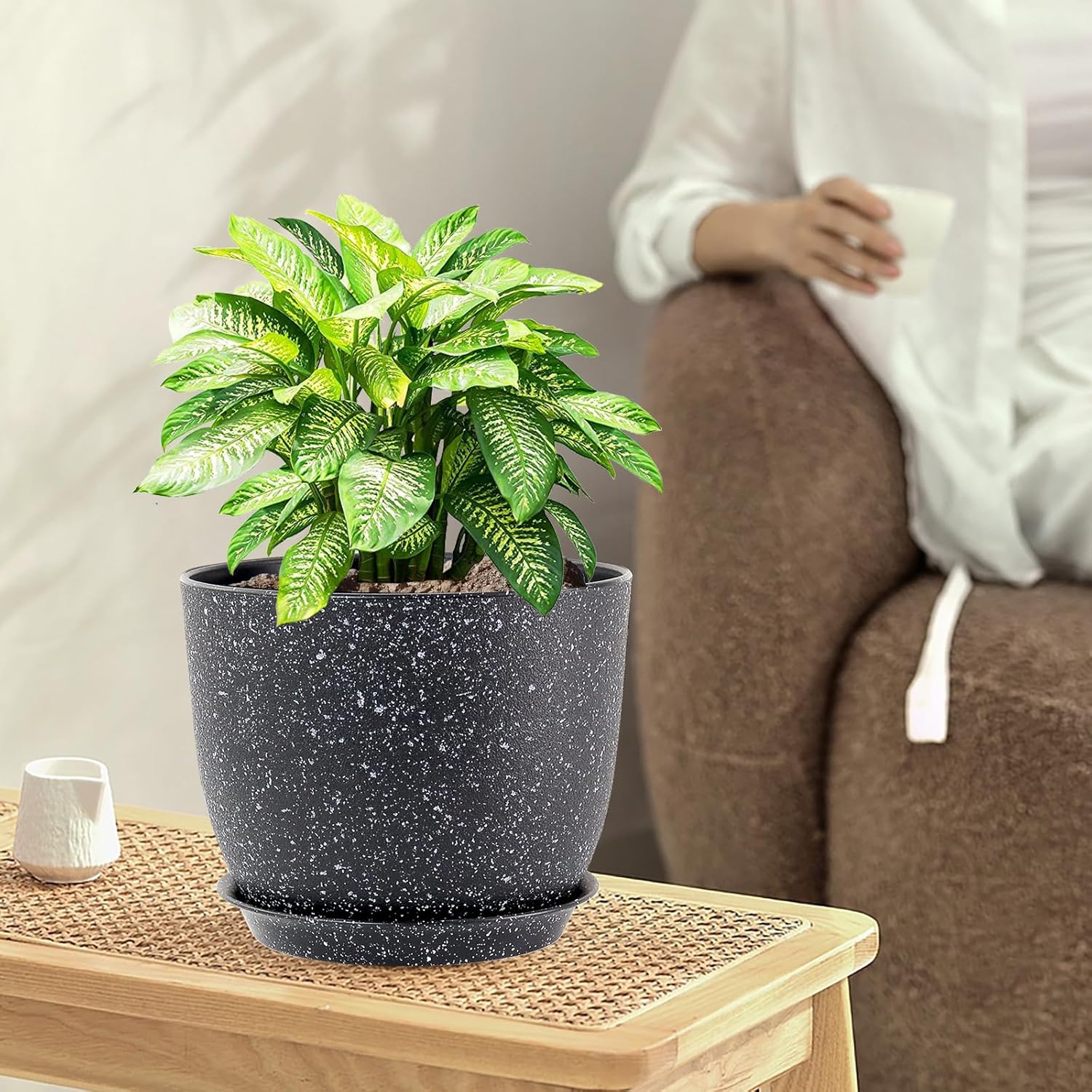 Plant Pots 10/9/8 inch, Set of 3 Modern Decorative Plastic Planters with Drainage Holes and Saucers for Garden House Plants, Flower Pots for Indoor Outdoor Plants, Speckled Black