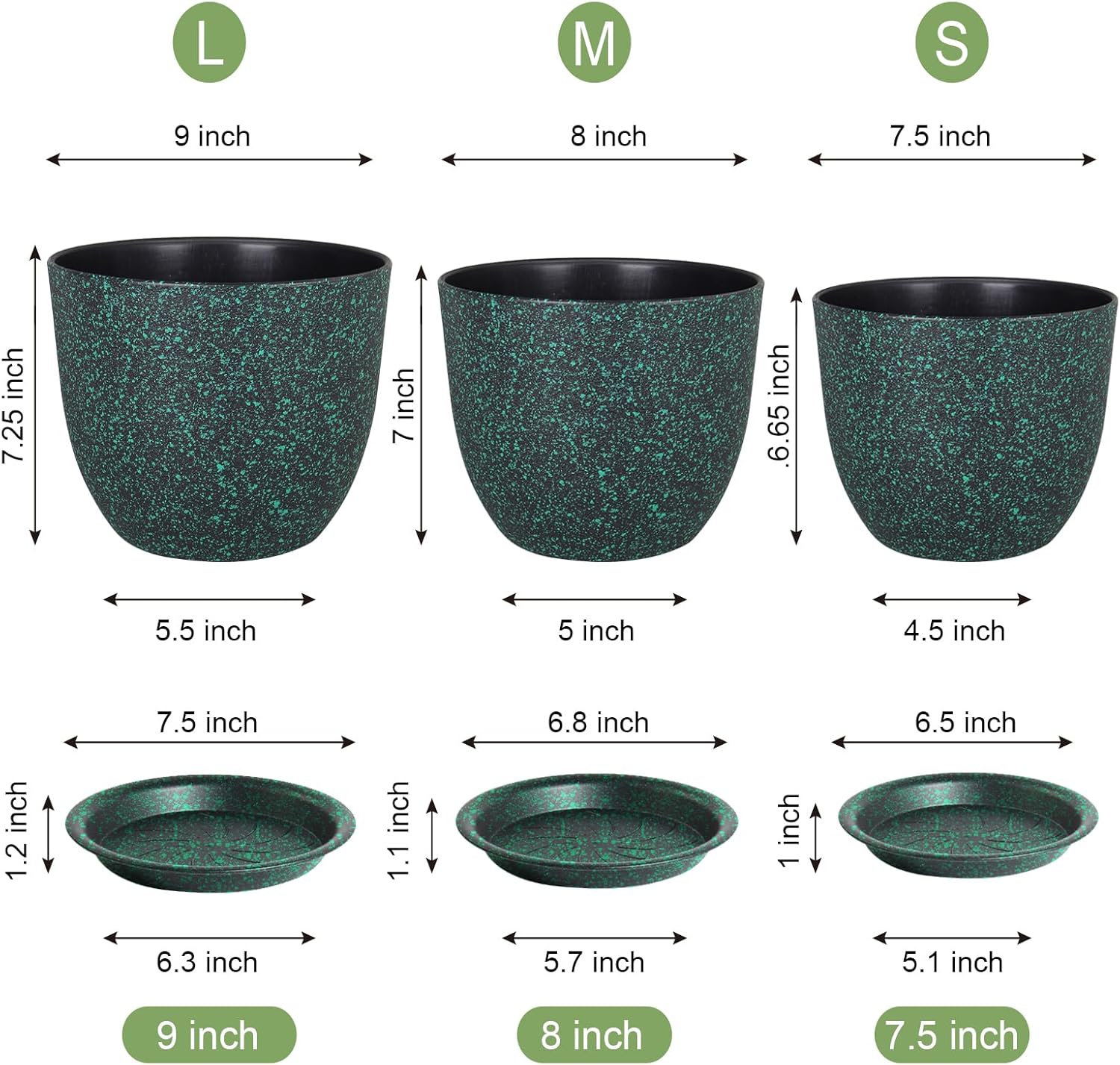 Plant Pots 9/8/7.5inch, Set of 3 Modern Decorative Plastic Planters with Drainage Holes and Saucer for Garden House Plants, Flower Pots for Indoor Outdoor Plants, Black with Green Speckles