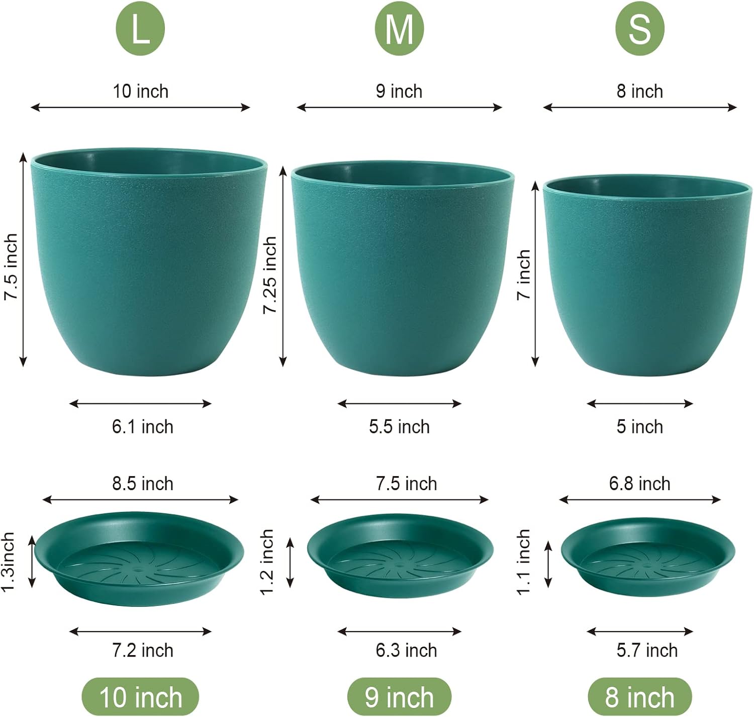 Flower Pots 10/9/8 inch, Set of 3 Modern Decorative Plastic Planters with Drainage Holes and Tray for House Plants Indoor Flowers Plants, Plant Pots for Indoor Outdoor Plants, Blue Green