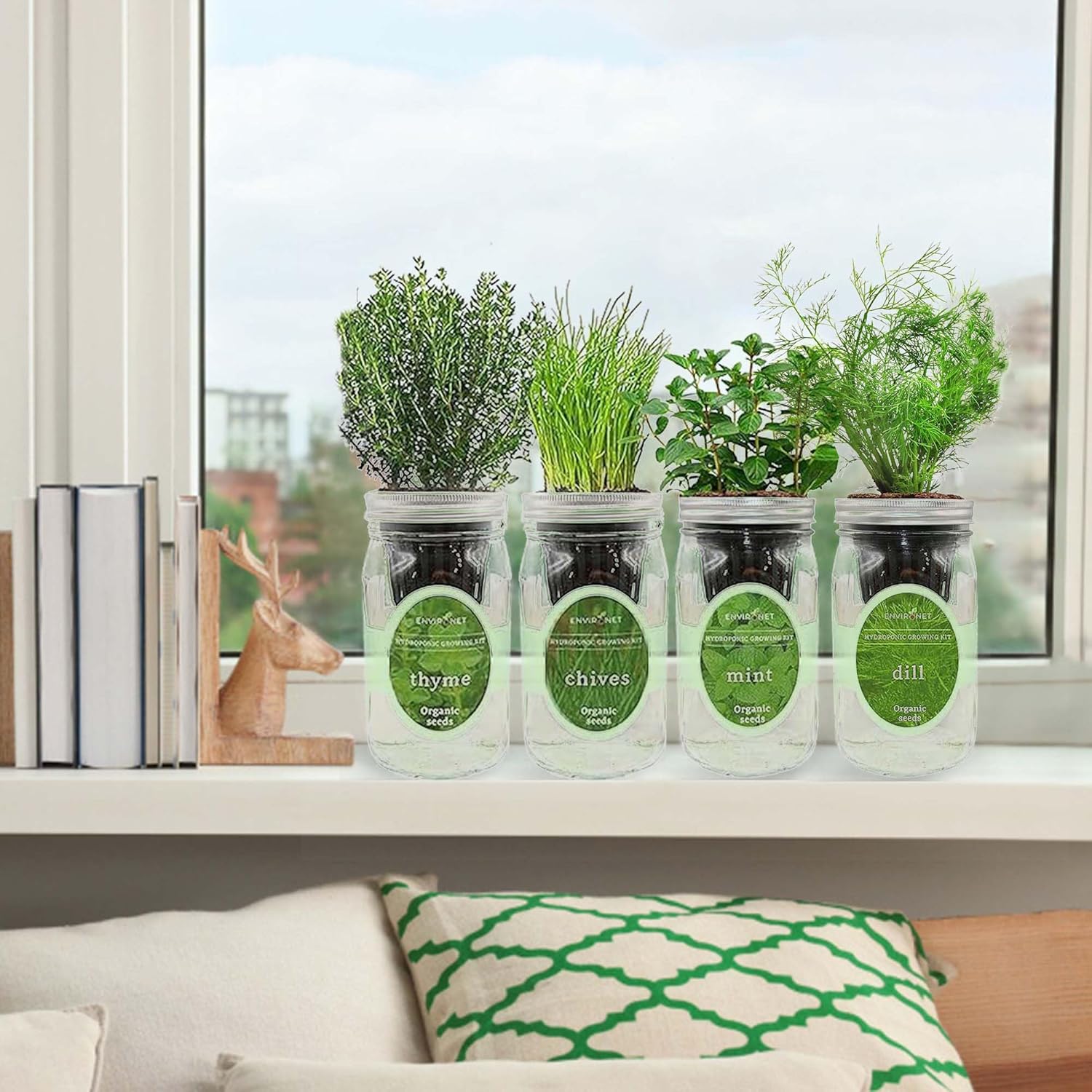 Hydroponic Herb Growing Kit Set, Self-Watering Mason Jar Herb Garden Starter Kit Indoor, Grow 4 Kinds of Herbs from Seeds (Mint,Thyme,Chives&Dill)