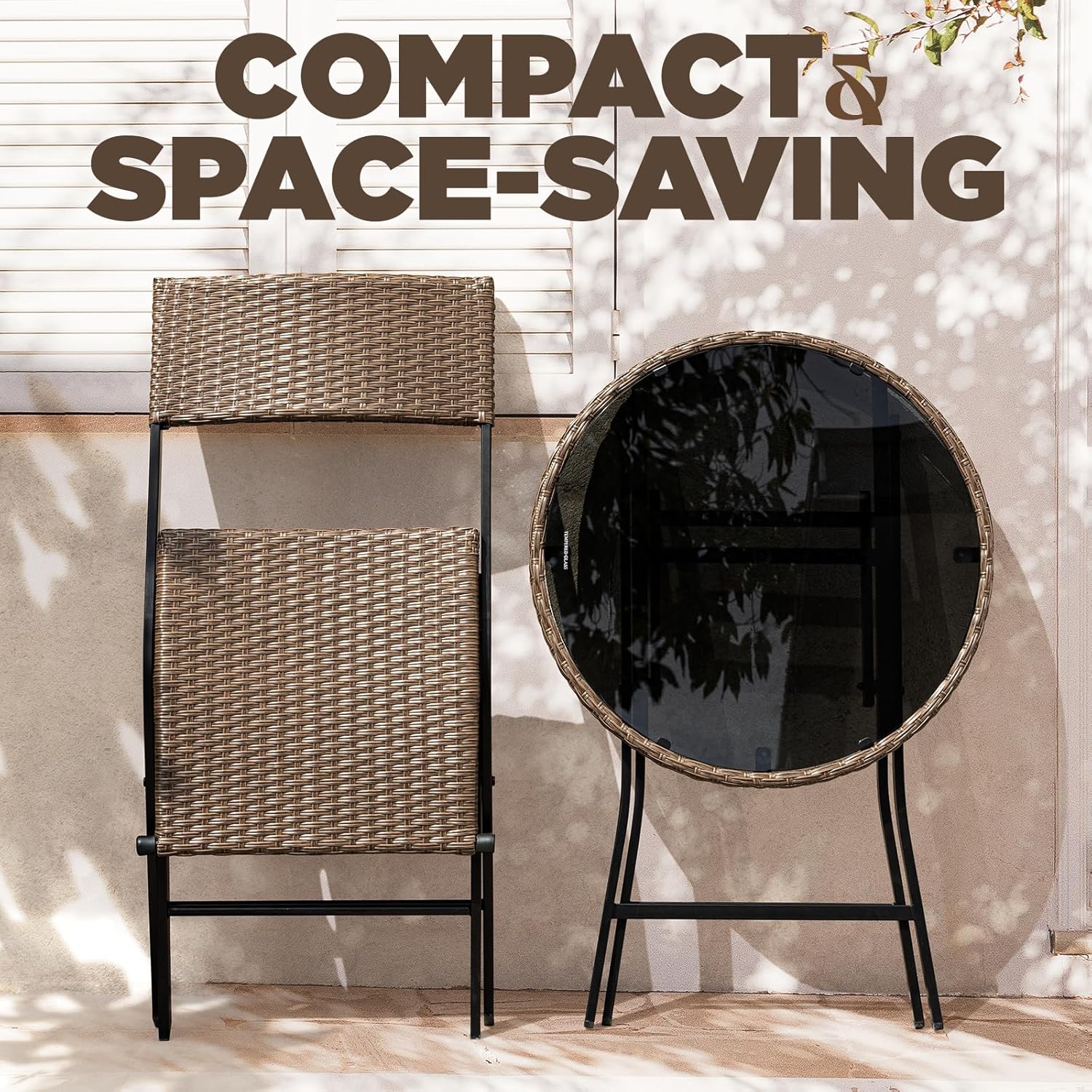 - All-Weather Brushed Resin Rattan Patio Set: This 3-piece outdoor bistro set features high-grade woven brown PE wicker and a sturdy powder-coated steel frame, ensuring rust-proof durability and strong load-bearing capacity. The ergonomic design of the foldable patio chair, with integrated comfy seat support, offers exceptional comfort and support for your guests' upper bodies