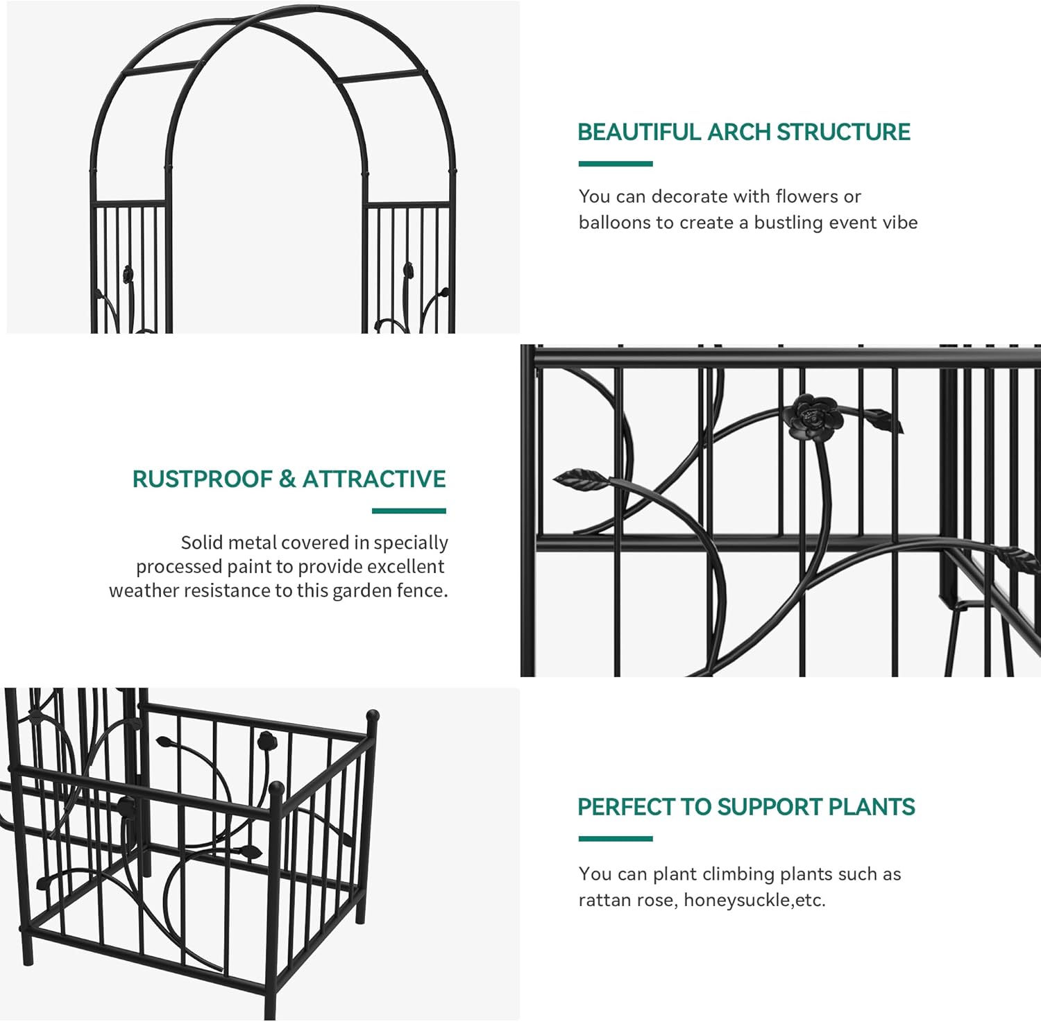 - Versatile Garden Arch: Decorate this garden arbor at will with climbing plants or other decor such as roses, honeysuckle, clematis, jasmines, balloons, tulle, lace mesh, or even with a string of lights.
