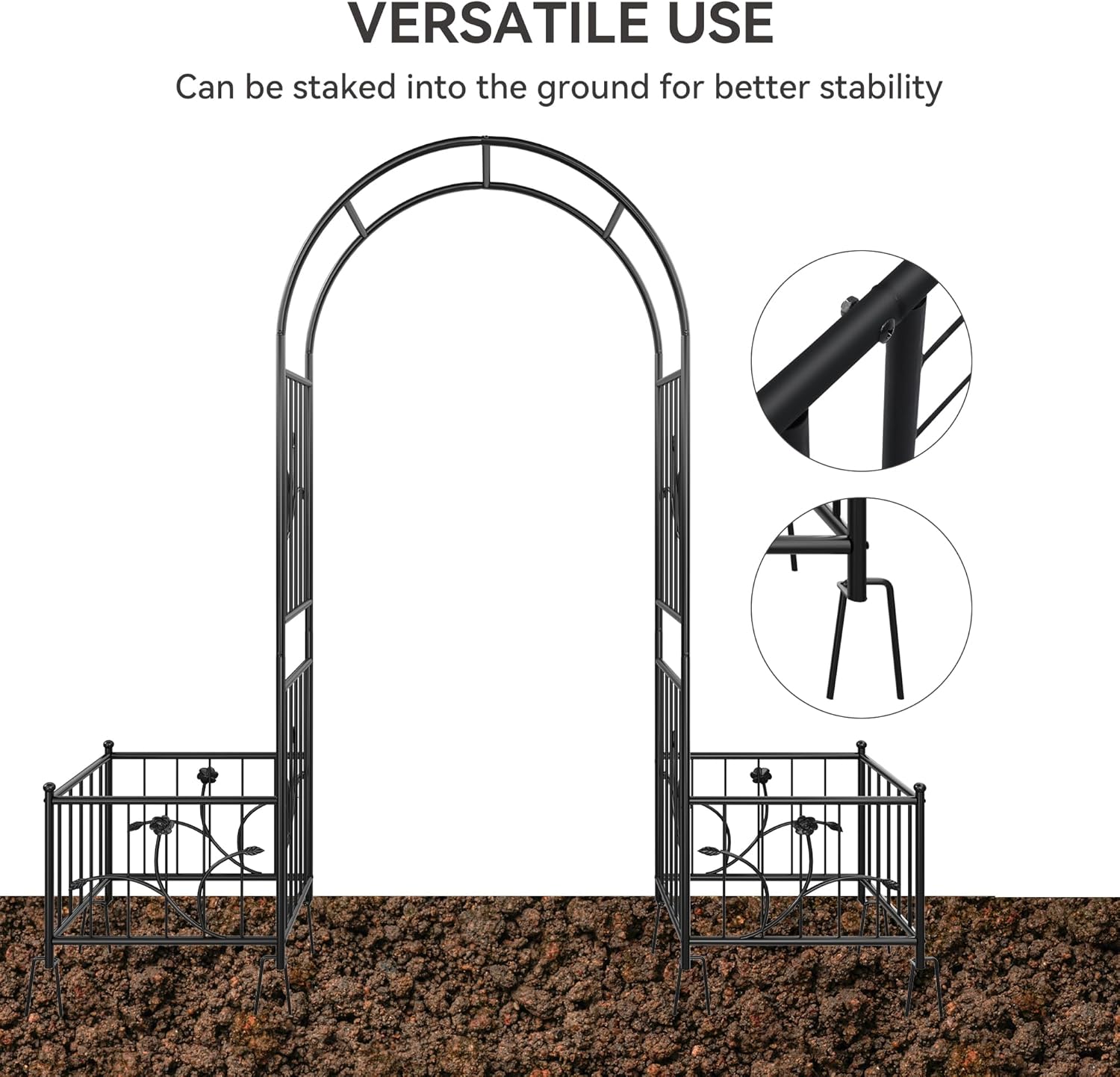 - Durable & Stable: Sturdy steel tubing is treated with weather-resistant black epoxy to ensure stability and prolonged outdoor use; The reinforced supporting frame at the bottom features ground stakes so that the garden arch can withstand weather elements.