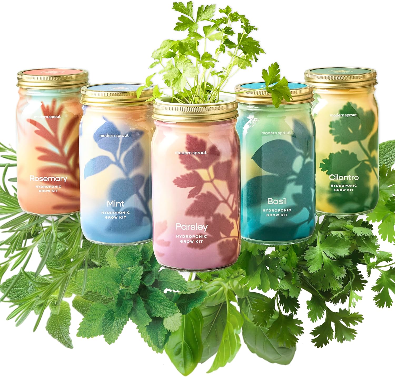 Modern Sprout New & Improved Mason Jar Grow Set, Indoor Herb Garden, Seed Starter Set, Organic Seeds, Hydroponic Growing (Basil + Mint + Parsley + Cilantro + Rosemary)