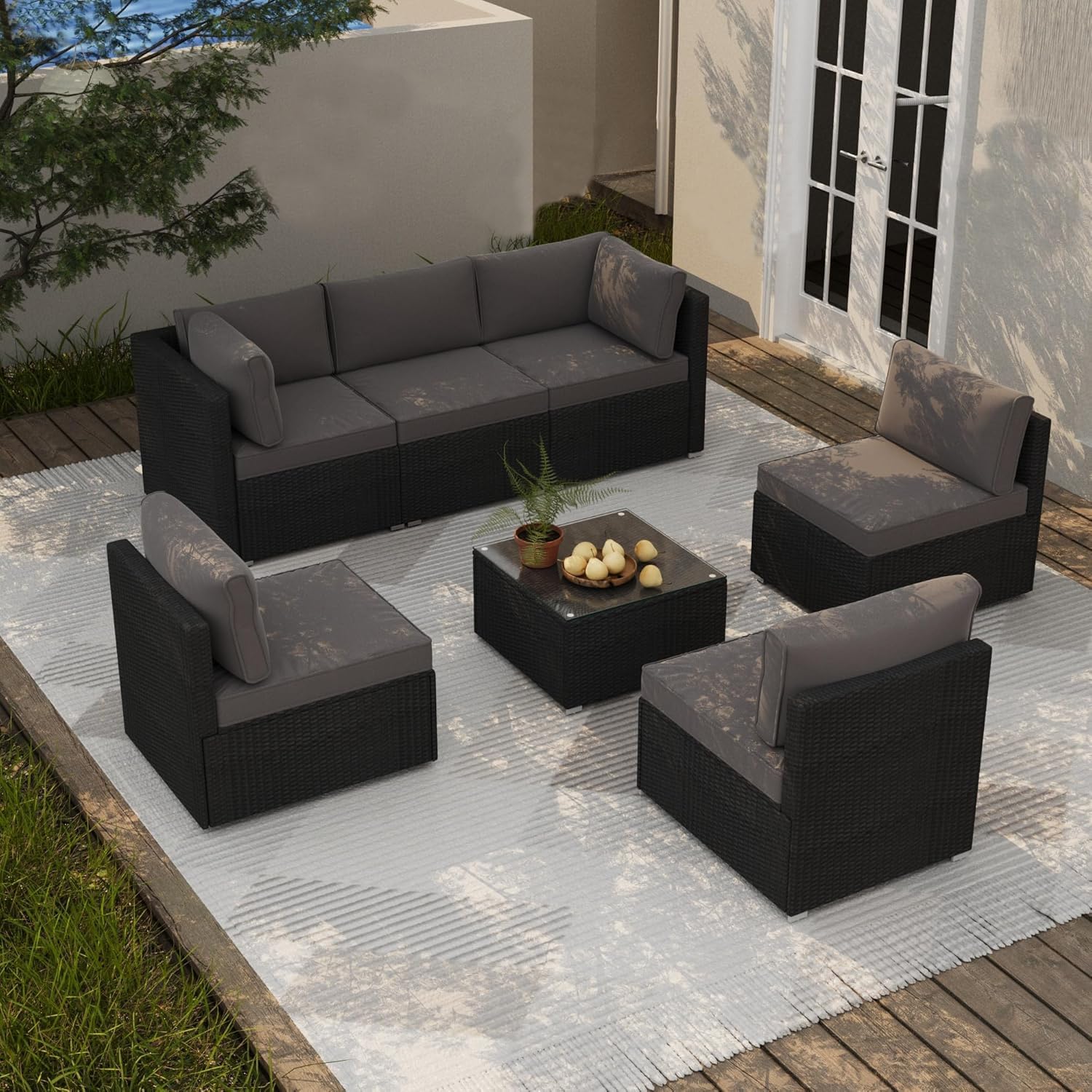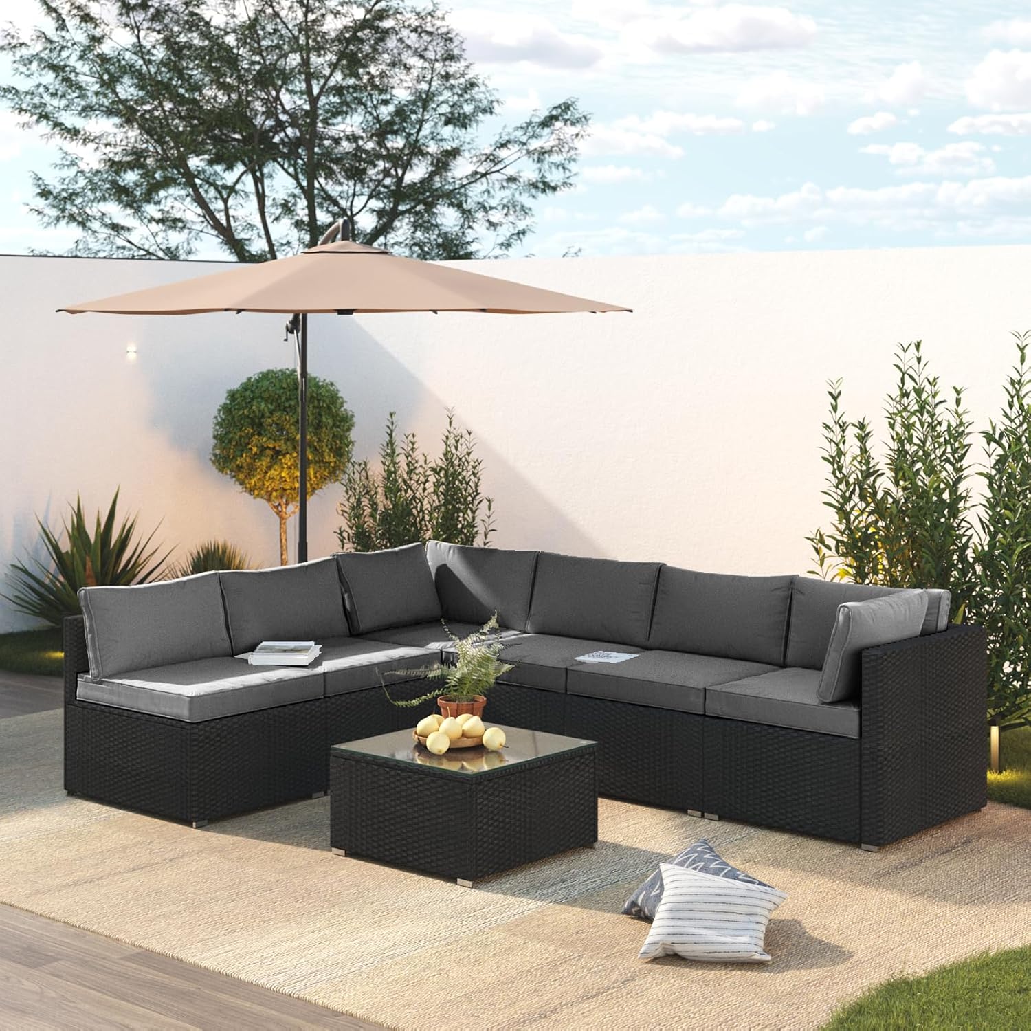 7 Piece Patio Furniture Set, Outdoor Couch Set—All-Weather Outdoor Furniture Sectional w Water Resistant ThickCushions, Patio Sofa Set w 2 Extra Pillows and Coffee Table, Deep Gray/Black