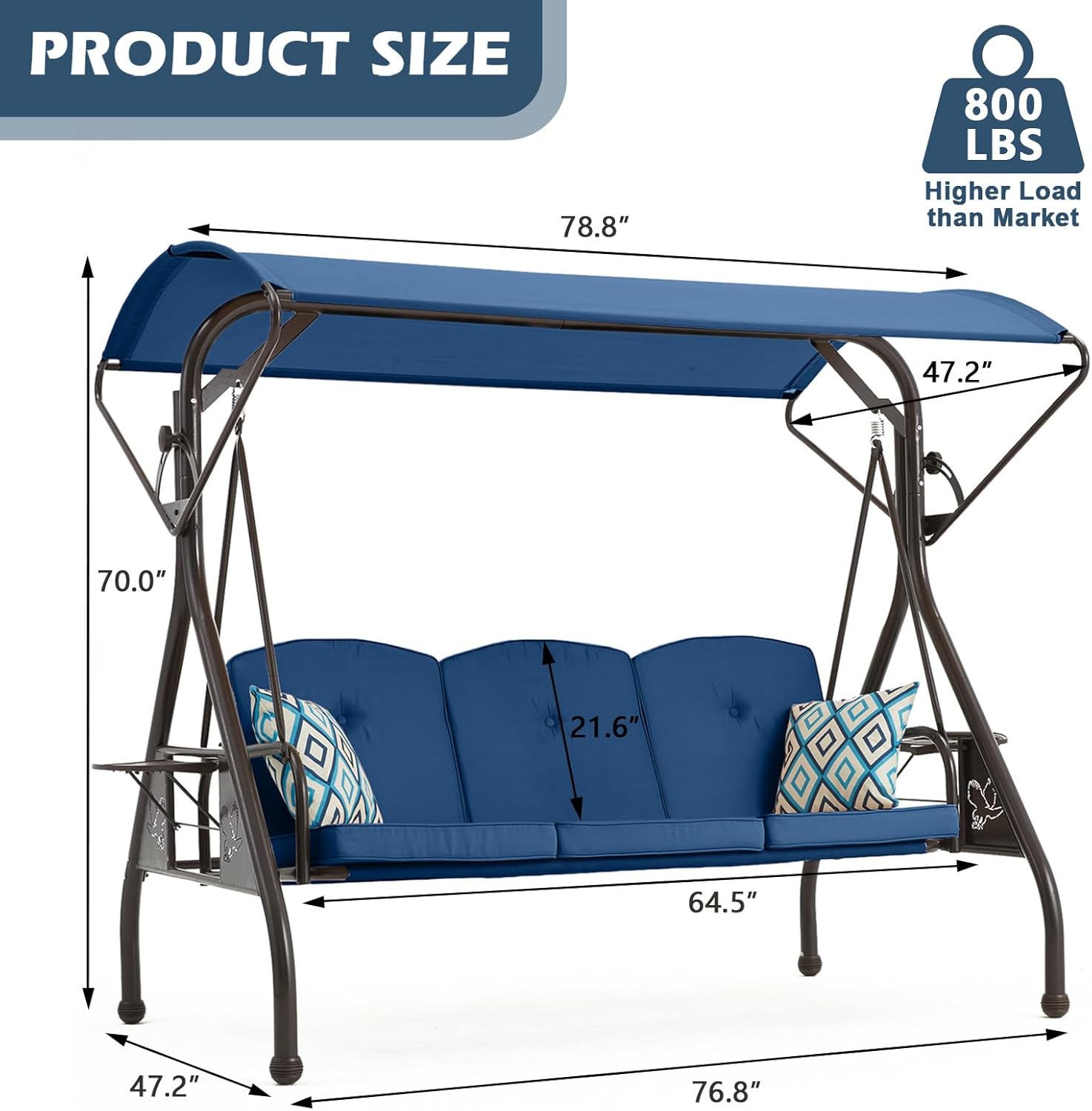 800LBS Patio Swing with Canopy 3 Seat Outdoor Porch Swing with Stand w/Cup Holder & Pillow Glider Chair Swing Bed for Patio Backyard Poolside (Blue)