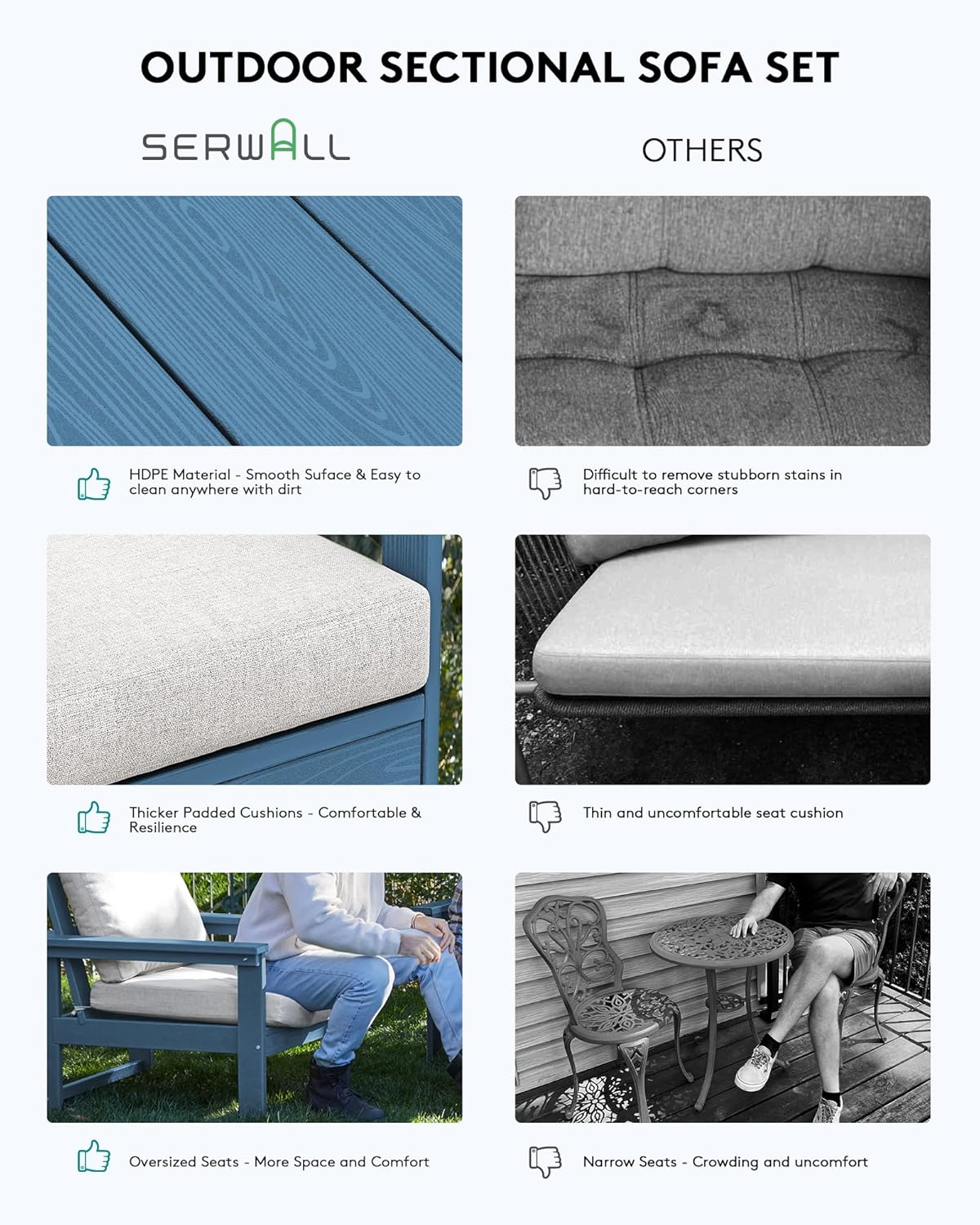 - Exceptional Durability & All Weather: Crafted with HDPE material, this outdoor sectional sofa is built to last, withstanding the test of time and heavy use, each seat can hold up to 360LBS. The weather-resistant HDPE material ensures that this sofa can withstand various weather conditions, making it perfect for outdoor use.