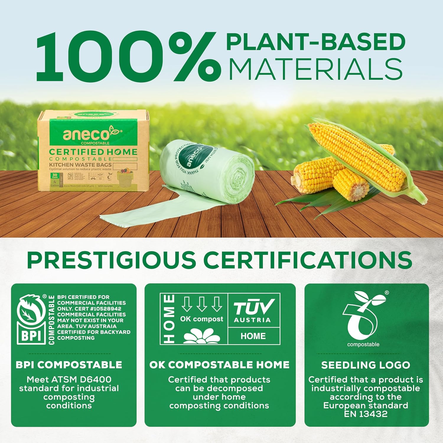 - 🍀 𝐒𝐮𝐬𝐭𝐚𝐢𝐧𝐚𝐛𝐥𝐞 & 𝐍𝐚𝐭𝐮𝐫𝐚𝐥𝐥𝐲: Made from renewable resources like corn starch and plant-based materials, ANECO compost bags for countertop bin decompose naturally into CO2, water, and biomass within a year, leaving no harmful traces. Prestigious certifications from BPI Compostable (US standard ASTM D6400), TUV Austria (OK Compost Home), and European Bioplastics (Seedling Logo) guarantee their eco-friendliness.