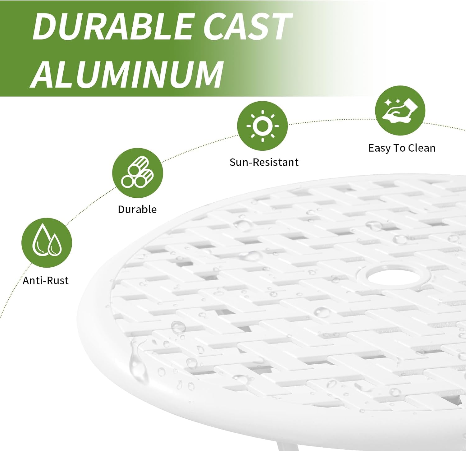- Cast Aluminum: Made of solid cast aluminum that resists rust and weather, helping to ensure a sturdy set that lasts for years to come. Max Weight of Capacity: Table: 200lb, a single Chair: 396lb.