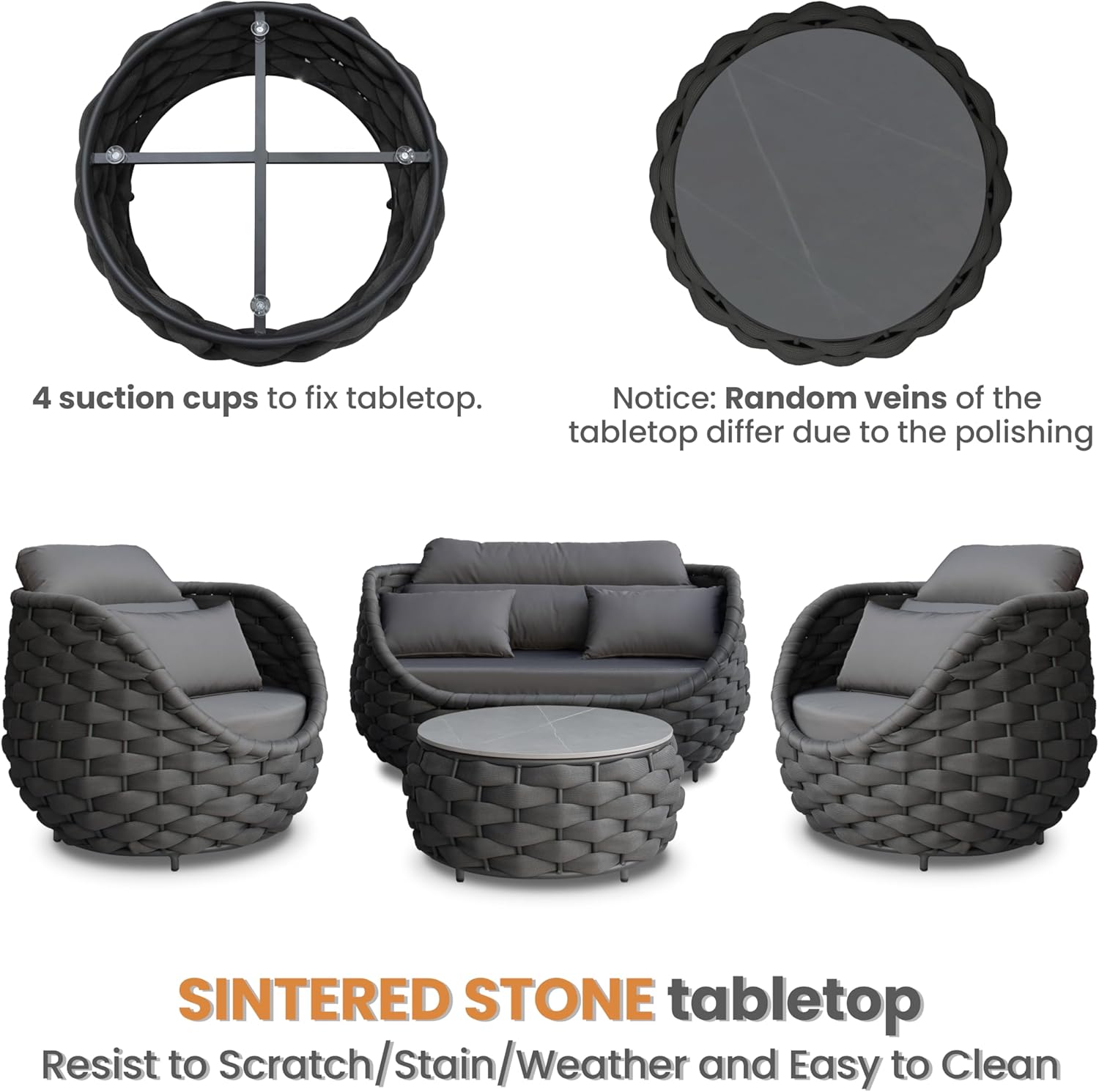 - Details of Sofa Set : All legs of the outdoor sofa set are equipped with an adjustable foot pad to ensure stability and prevent scratches. 0.4'' thick sintered stone tabletop offers a highly durability of resistant to heat, UV, water, stain and scratch