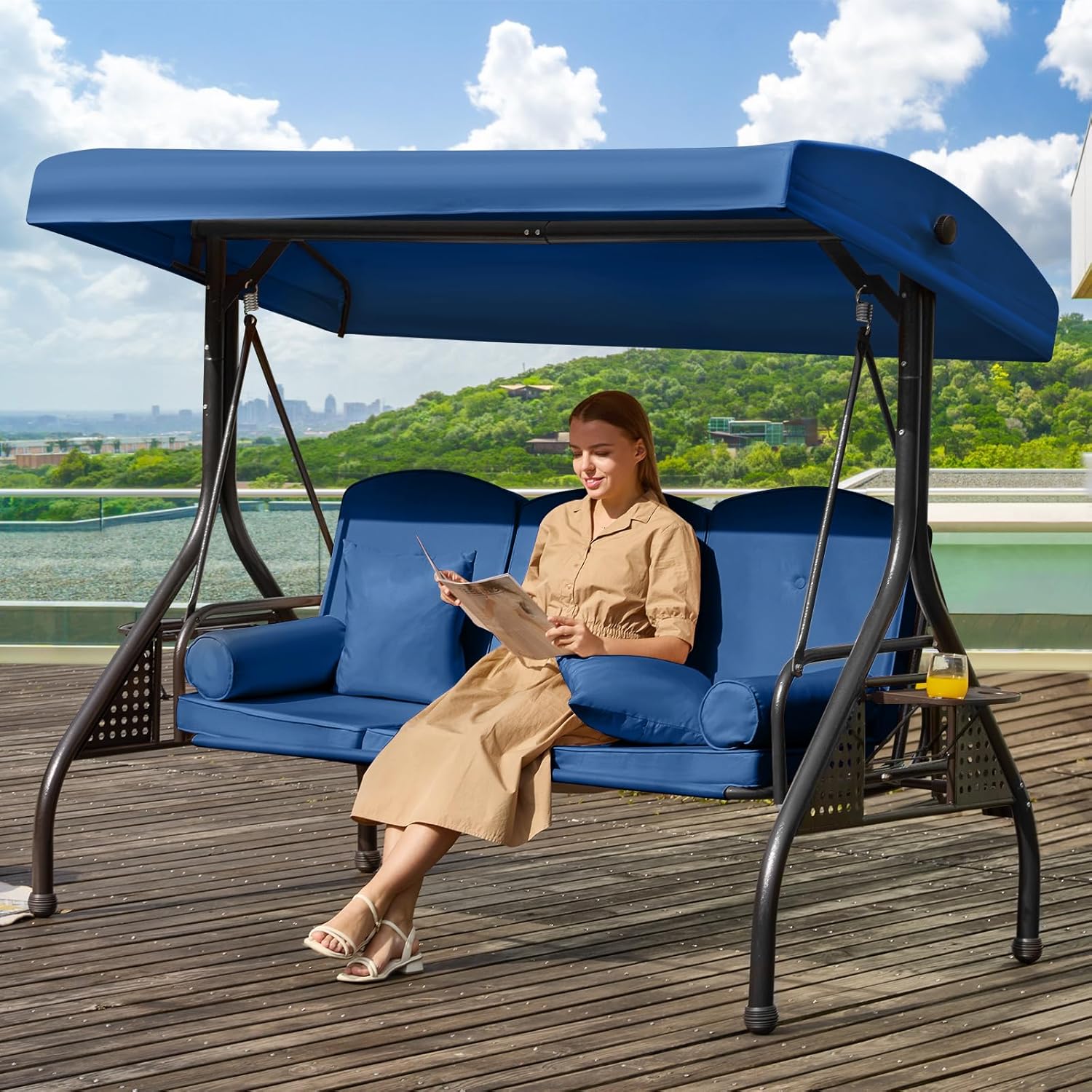 3 in 1 Outdoor Porch Swing with Adjustable Canopy, 3 Seat Outdoor Swing for Adults, Patio Swing Chair with Thickened Cushions,Pillows & Cup Holders for Backyard, Porch, Garden (Blue)