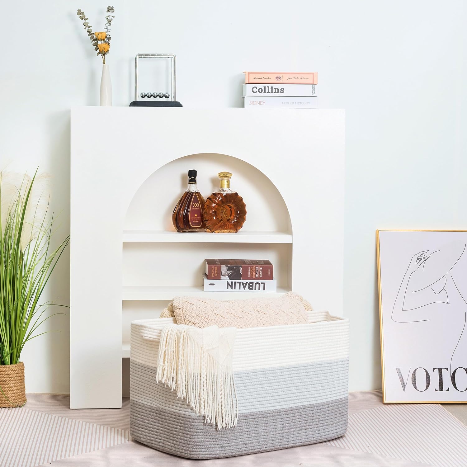 MINTWOOD Design 22in Extra Large Blanket Basket Holder Living Room, Rectangle Rope Woven Storage Basket with Handles for Laundry, Pool Towels, and Shoes, Dog Toy Organizer Bin Box, 3-Tone Light Gray