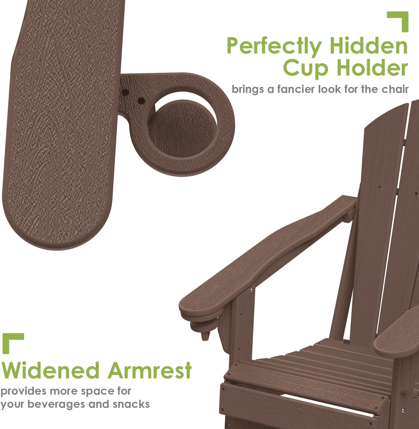 - 【Ergonomic & Foldable】 GreenVines Folding Adirondack chair features a hidden cup holder in the right arm, offering ample space for drinks or media devices. The reclined legs are designed for stability without the need for pins or chains. Easily foldable, this chair is perfect for storage at home or for taking on road trips. The slatted seating ensures quick drying after rain, while trimmed edges enhance safety for you and your family