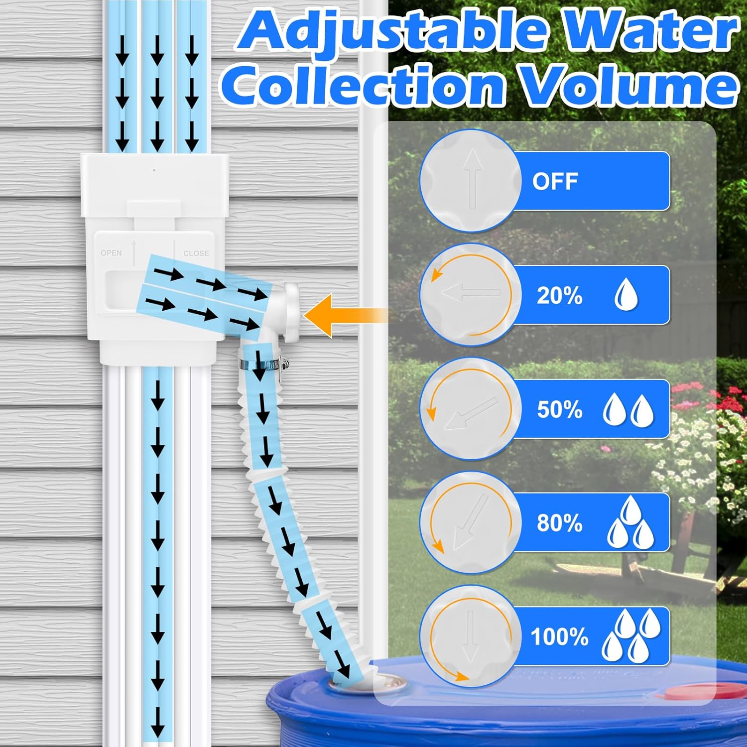 - Adjustable Water Collection: The valve of the rainwater collection system can adjust the amount of rainwater collection. There are 5 types of water flow control: closed, 20%, 50%, 80%, and 100%. If the rain barrel is full of water, you can turn off the switch to prevent rainwater from entering the rain barrel and prevent water from overflowing.