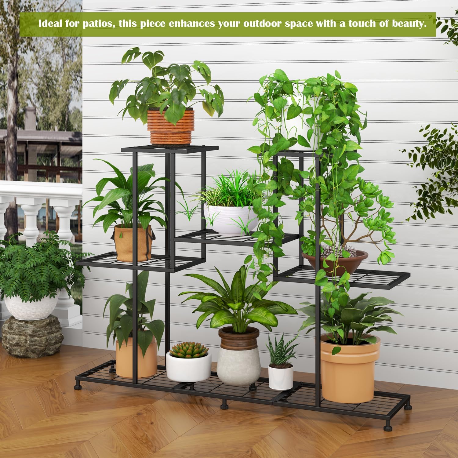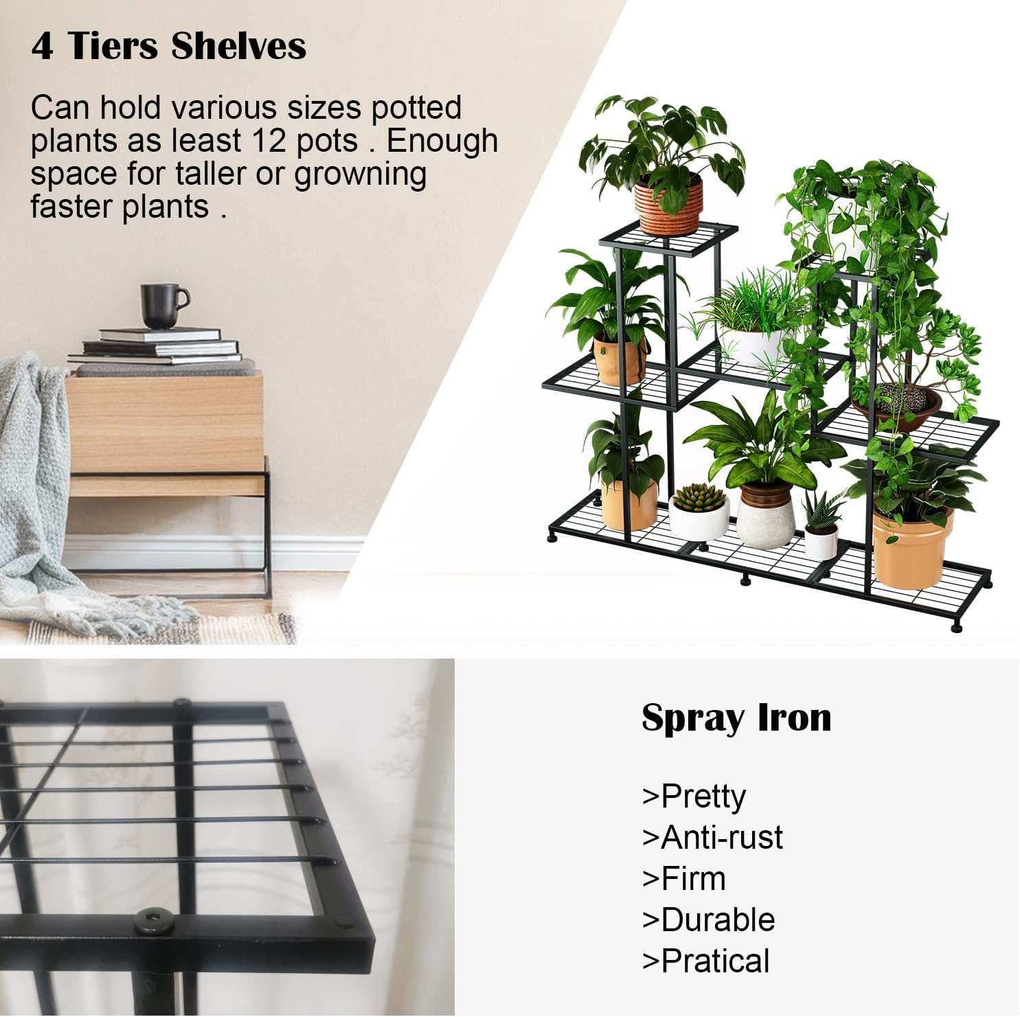 - 【4 TIER LARGE CAPACITY】size: W 43.8 x H 32.2 x D 9.8 inch,Each rack is wide and spacious enough to hold most pots.Multi layer high and low garden plant shelf with opening design,no shelter from each other,easy to handle and water,helps plants get enough sunlight for growth.(The plant organizer can hold up to 12 pot plants.)Space-saving, you can place in corner of the living room, garden, balcony and bedroom. Perfect for decorating your home.