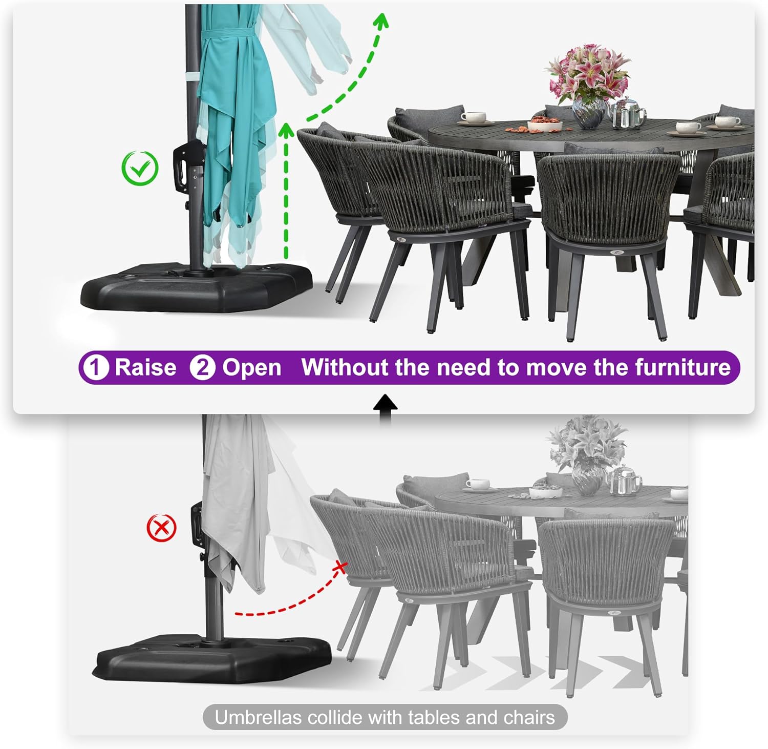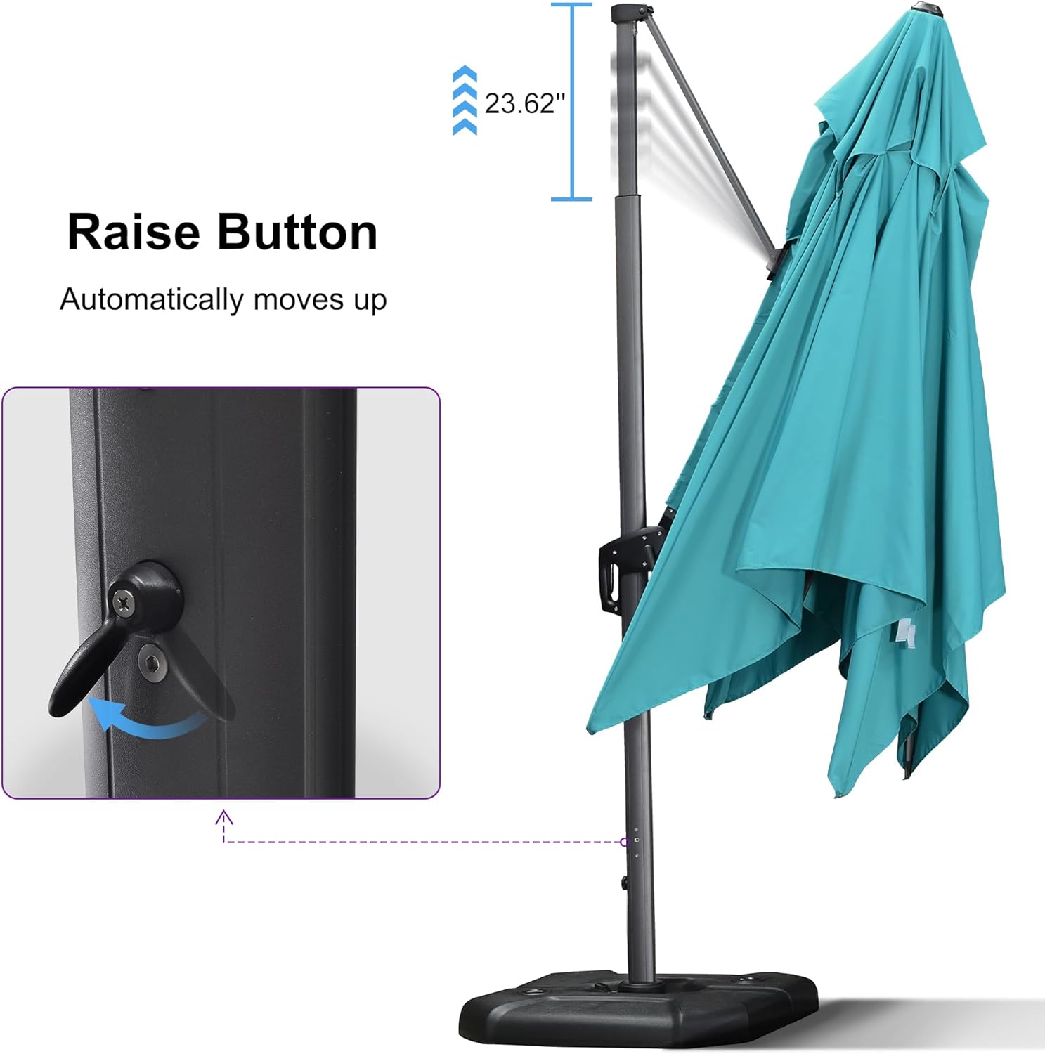 - Five-level Adjustment & 360° Rotation: The crank system of this cantilever umbrella makes it easy to raise and lower the canopy, the unique handle design also makes tilting the patio umbrella effortless, foot pedal allows for complete 360 degree rotation