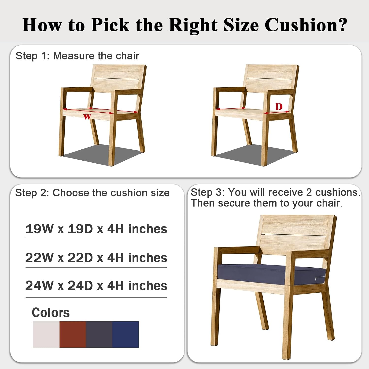 - PERFECT SIZE: Outdoor chair cushion set includes 2 cushions. Cushions measure: 22 inch (W) 22 inch (D) 4 inch (H). Fits most standard size outdoor chairs. Since the outdoor cushions are vacuum-packed, it may take 24-51 hours for the cushion foam to fluff back up after opening the vacuum bag