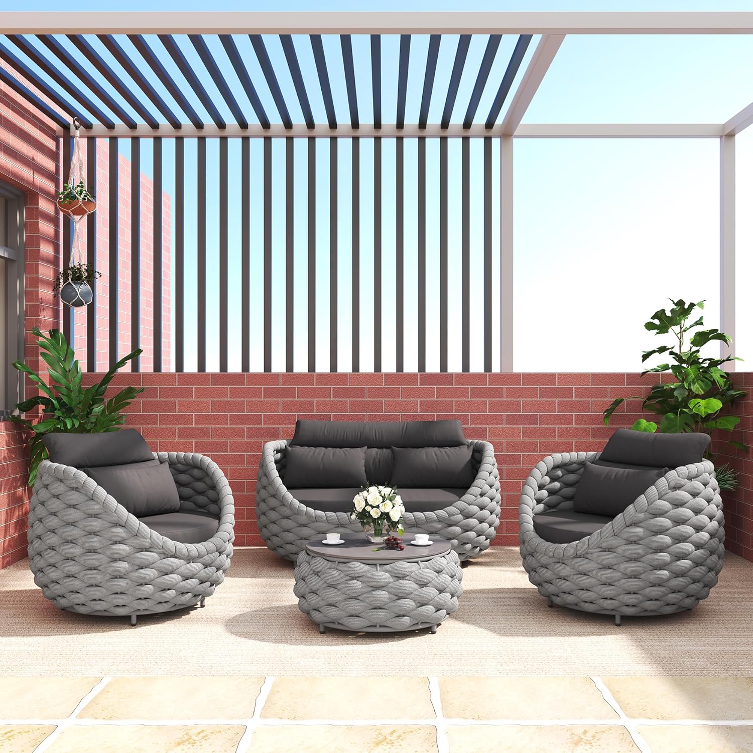 - Sturdy & Durable:Rope woven outdoor furniture with high quality aluminum alloy,no rust,no deformation,hand woven polyester rope are strong enough to withstand all weather variations.Outdoor patio furniture set cushions balance well with sturdy frame