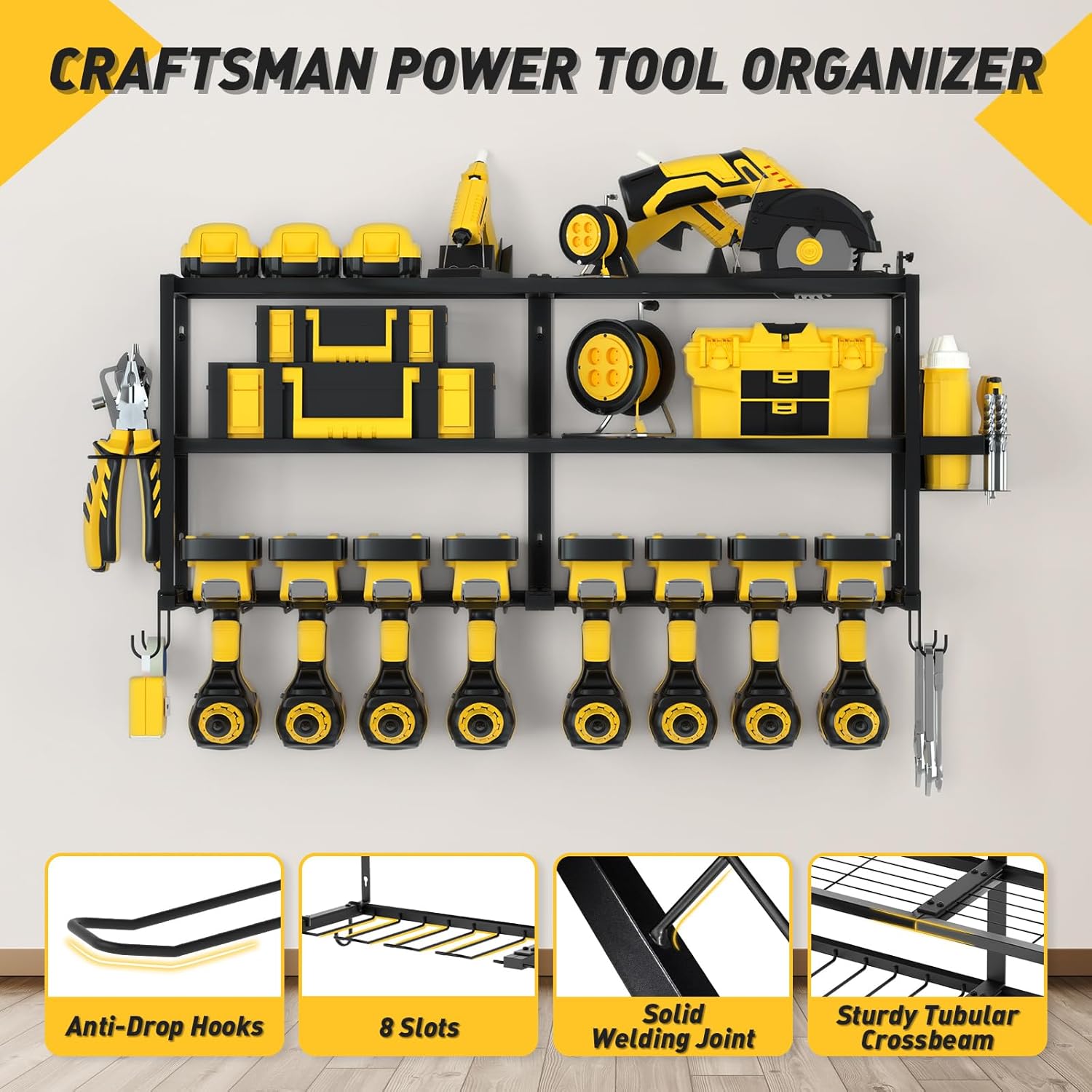 Large Power Tool Organizer Wall Mount for Fathers Dad, 3 Extra Large Layers Heavy Duty Metal Garage Organization Loads 300lbs with 8 Cordless Drill Holder, Power Tool Shelf for Workshop, Utility Racks