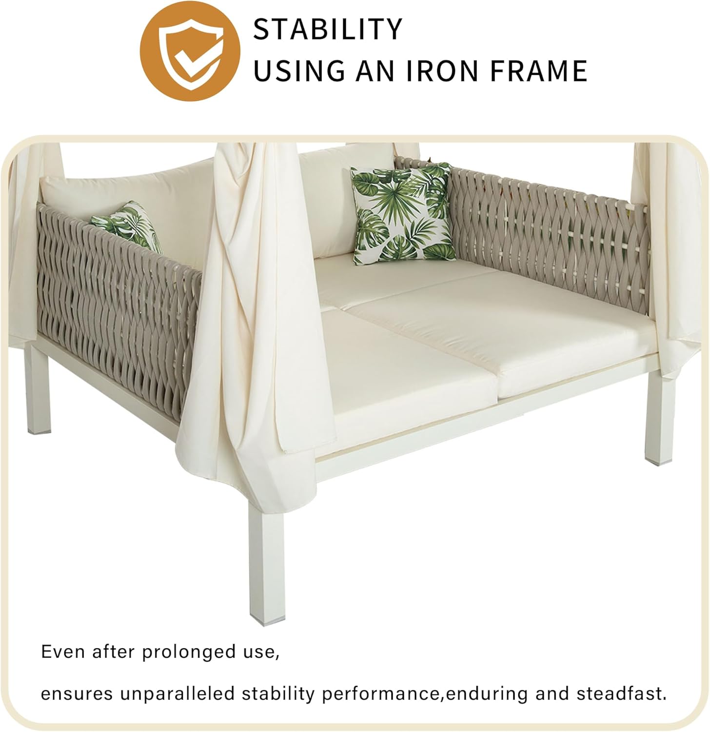 Polibi Outdoor Patio Sunbed with Beige Curtains,Outdoor Sun Lounger Bed with Pillows,Rubber Core Rope Weaving Outdoor Double Chaise Lounge Suitable for Pool,Garden,Beige