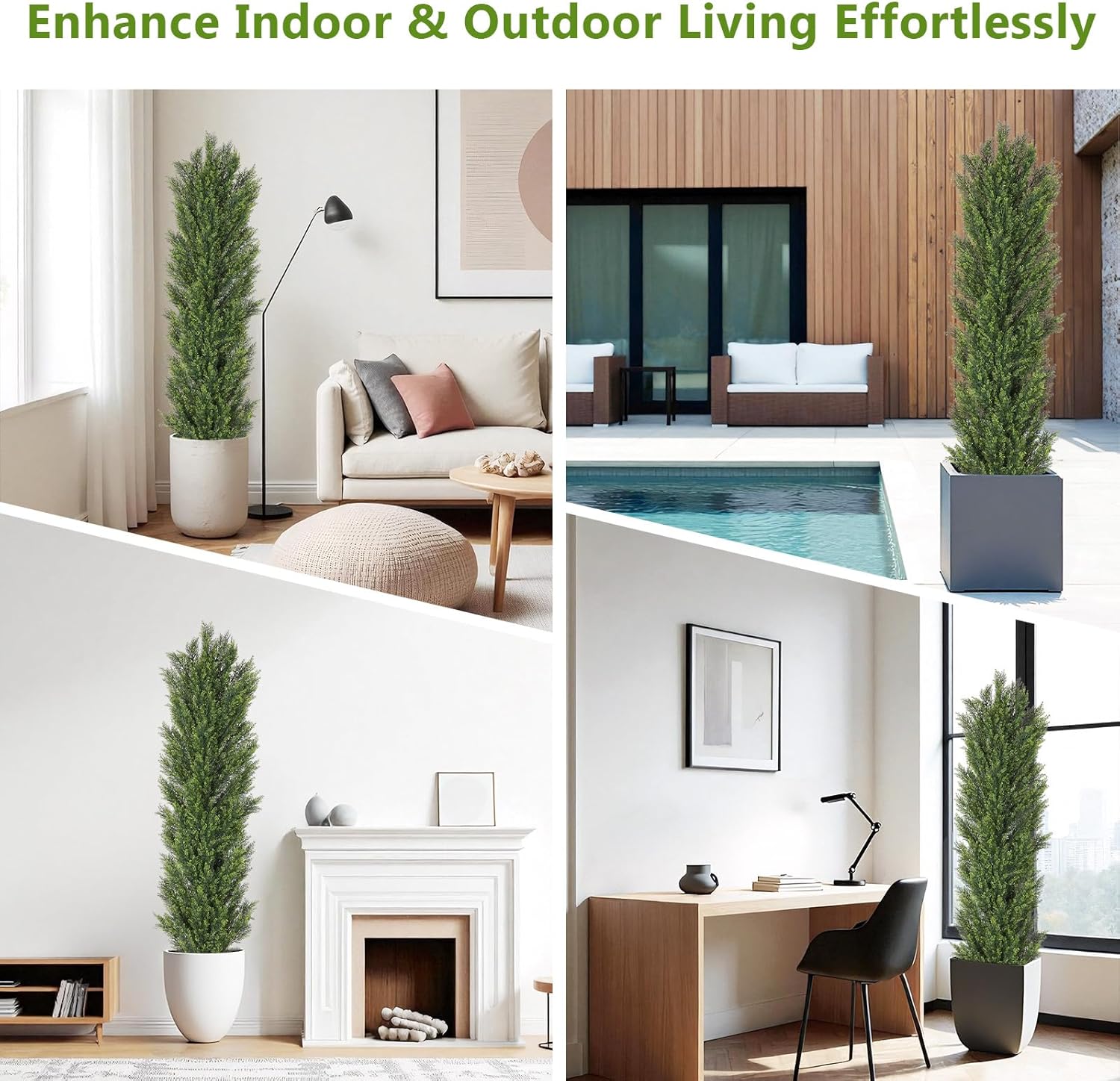 - 【Tall & Realistic Look – 6ft Natural Greenery】Standing 6 feet tall from the bottom of the pot to the tip of the tallest leaf, this artificial cedar tree features dense, lifelike greenery that mimics a real evergreen shape. Please note: The tree is shipped compressed. To reach its full height and natural look, gently fluff the branches upward by hand after assembly