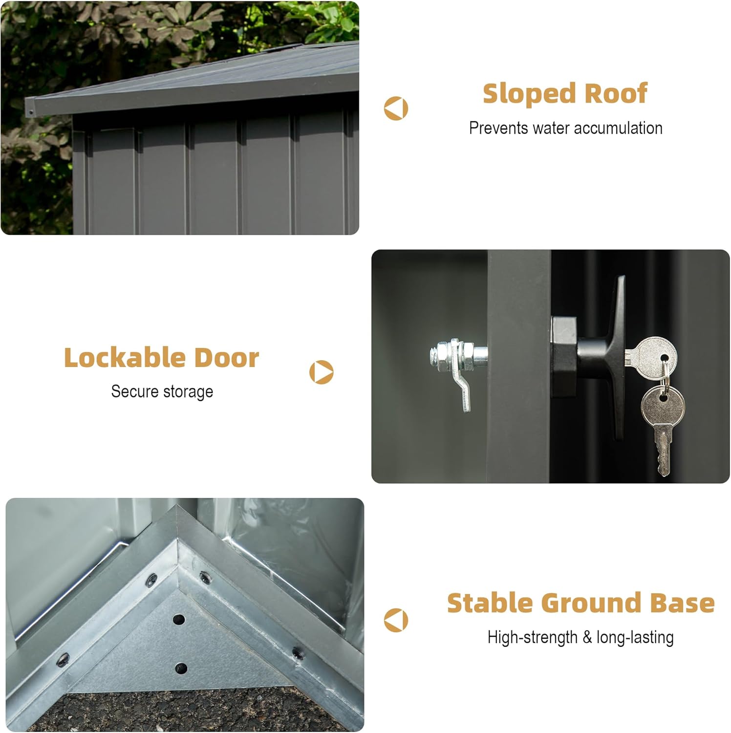 - 👉MULTIFUNCTIONAL DESIGN: The sloped roof also prevents rainwater harvesting and rust prevention. This design also helps protect your tools and other items during thunderstorms. Locked door protects your belongings and enhances the security of this tool shed. The appearance also adds a scenery line to your backyard.(1 Years Quality Guaranty For Lock)