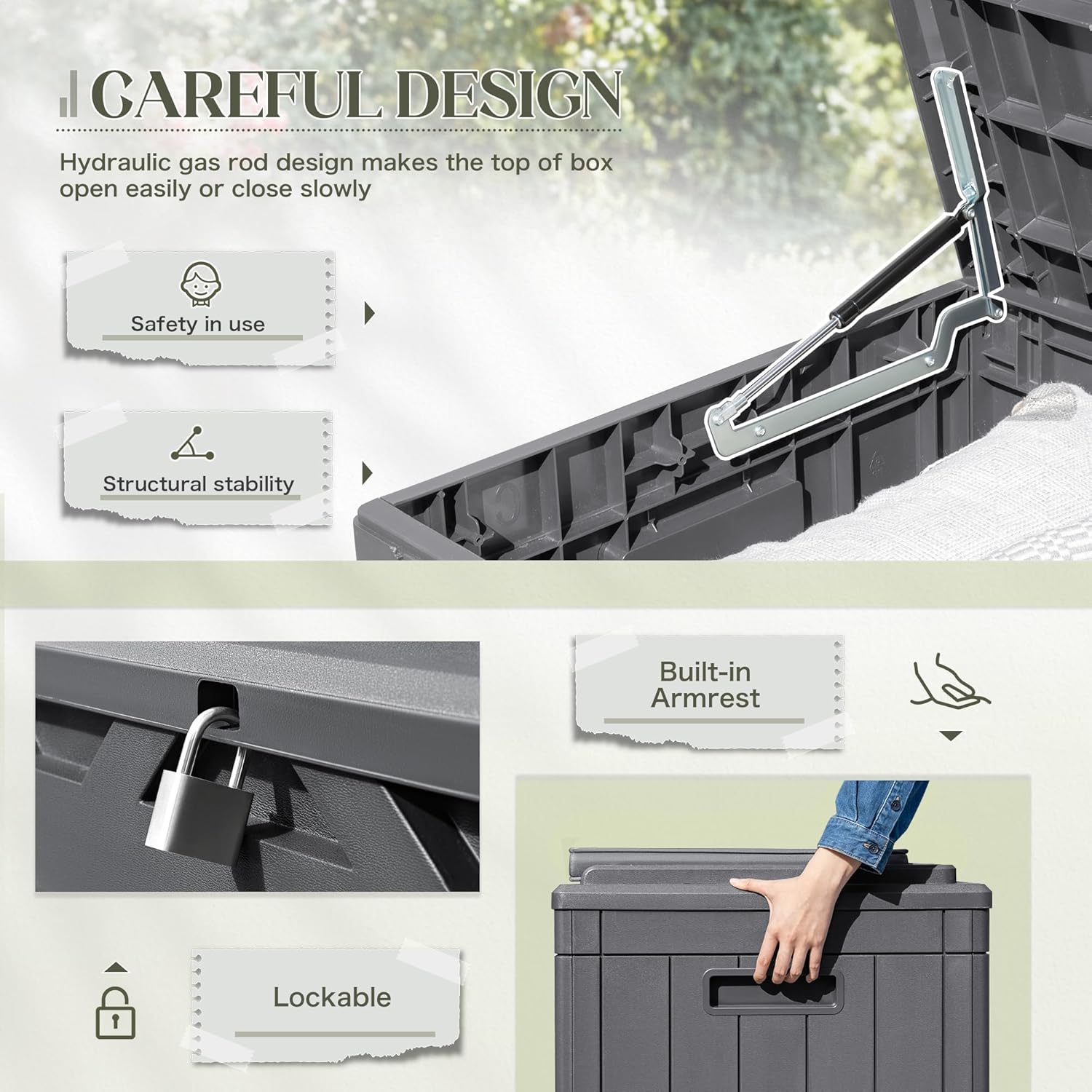 - EXTRA CUSHION:Besides helping you to organize your space, the deck box is equipped with a removable thick cushion, you can also use it as a stool to ensure your safety when opening and closing the box.