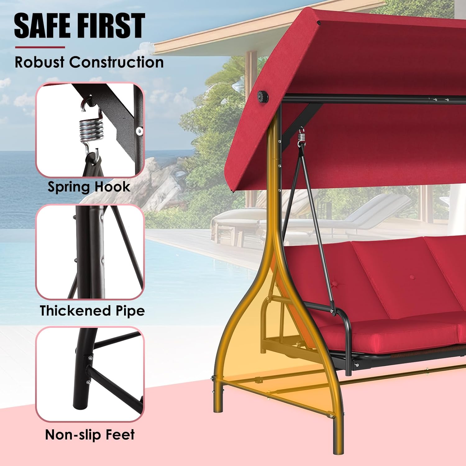 MAMIZO 3-Seat Outdoor Patio Swing, Porch Swings, Backrest Bench Sets, Glider Swing Bed Chair W/Adjustable Canopy, Thickened Removable Cushions, for Outside Backyard, Garden, 750LBS(Burgundy)