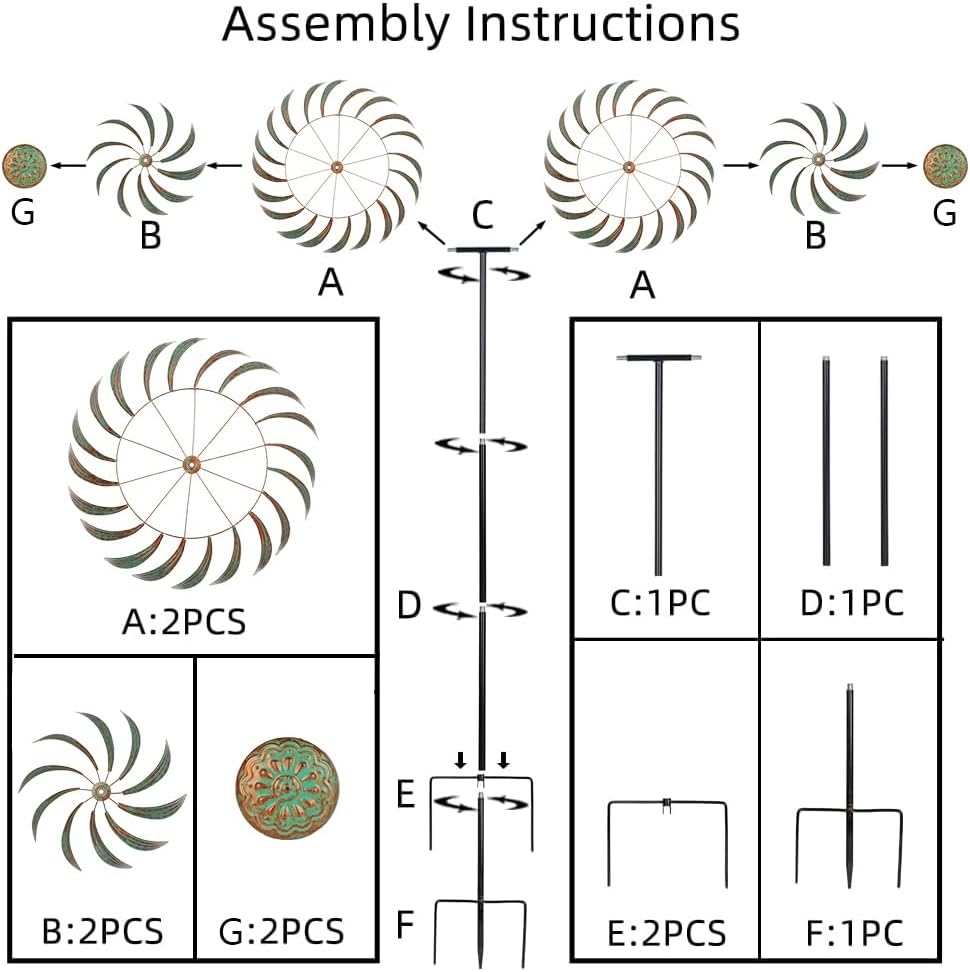 - Easy to Install: This large yard wind spinners have a simple and easy to install structure, without the need for any additional tools. Just follow the accompanying instructions for 3-5 minutes and you can quickly enjoy a happy courtyard life