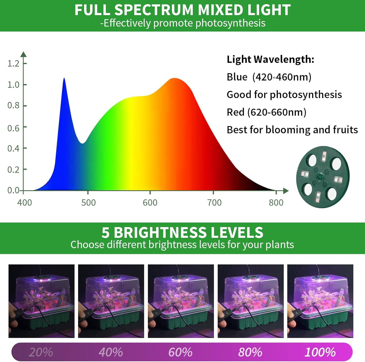 - 4-Level Timing Settings and 5-Level Brightness: Our seed starting trays offer customizable lighting schedules with options for 4, 8, 12, and 18-hour cycles, ensuring that your plants receive the appropriate amount of light at different stages of their growth. Additionally, the 5-level brightness control allows you to adjust the light intensity to meet specific plant light requirements.