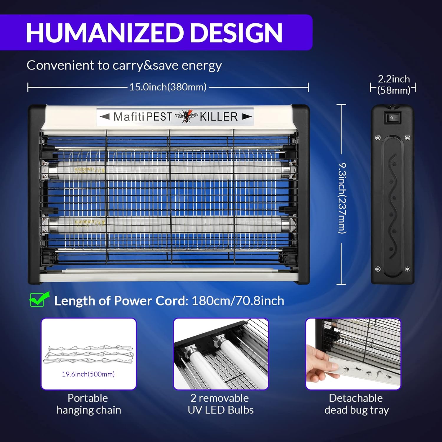 - 【 Safe and Eco Friendly 】 No any safety risk to you or the environment.Enjoy commercial strength pest control without the need for dangerous traps, repellants, poisons, sprays, chemicals or costly treatments. With protective grid to keep your kids and pets out of internal electrified grid. Its detachable grid design also allows you to replace the bulbs more portable.