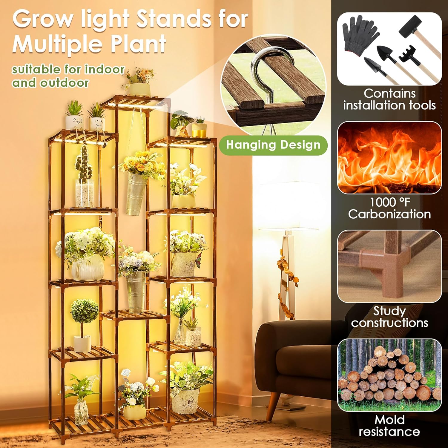 - 🌳Plant Shelf with Grow Light: Experience the convenience of our plant shelf with a built in full spectrum, timer controlled, and dimmable grow light. Your plants will thrive anywhere in your home without needing direct sunlight. Place them confidently in any room, and watch them flourish with ease