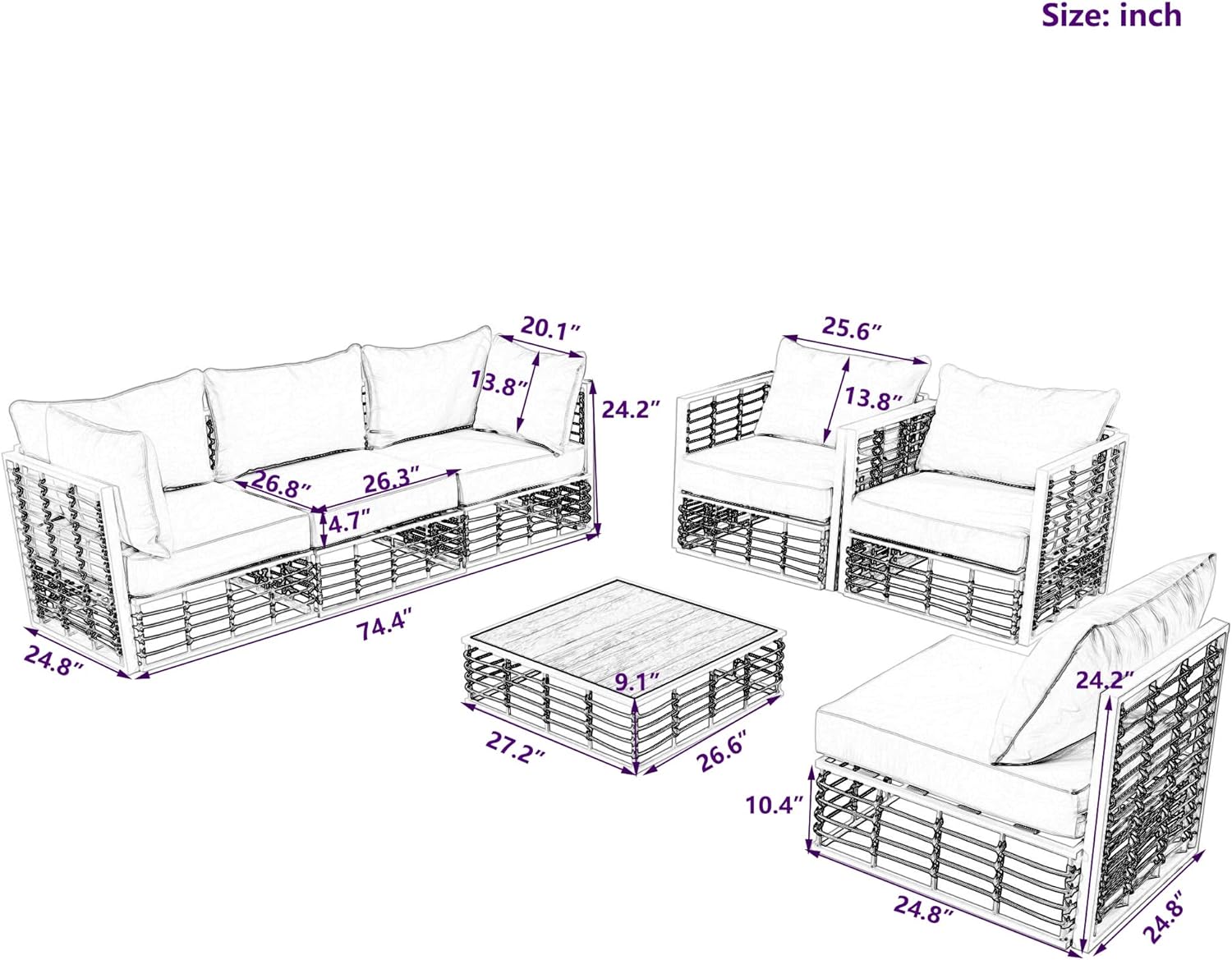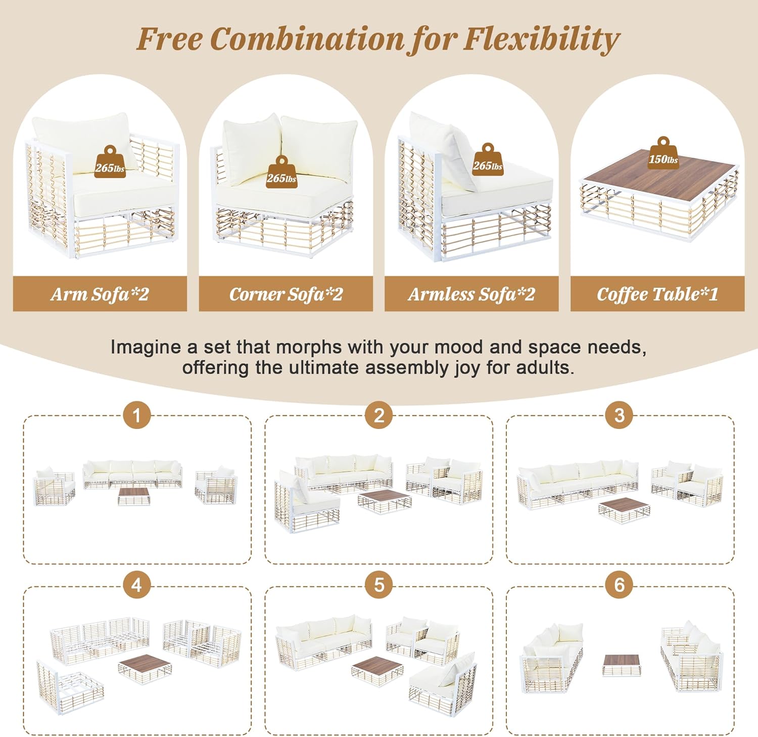 - 🌈[Sturdy & Stylish Framework] - Imagine a sofa set that's as tough as your love for the outdoors, yet as stylish as your indoor decor. Our outdoor 7-piece sofa set, boasting a metal frame and all-weather rattan weave, brings modern minimalist silhouettes and solid lines as well as durability into your garden. With its robust build, your comfort zone doesn't weather away and the set supports up to 265lbs per seat and 150lbs for the coffee table, ready to hold everything from day coffee to night candles.