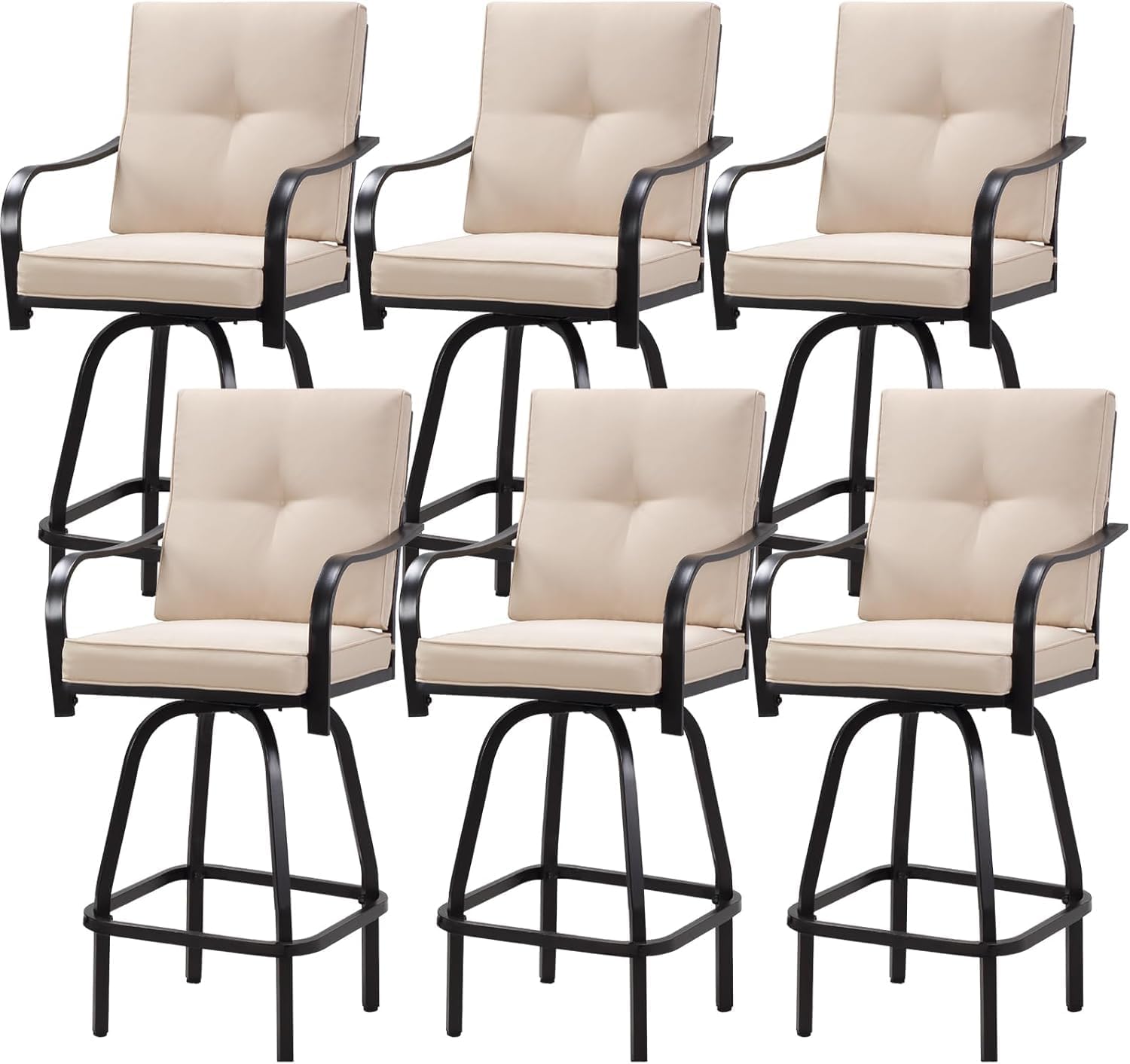Patio Swivel Bar Stools, Outdoor High Back Swivel Bar Chair Set of 6 with Cushion & All Weather Steel Frame for Backyard, Lawn, Poolside and Balcony, Beige
