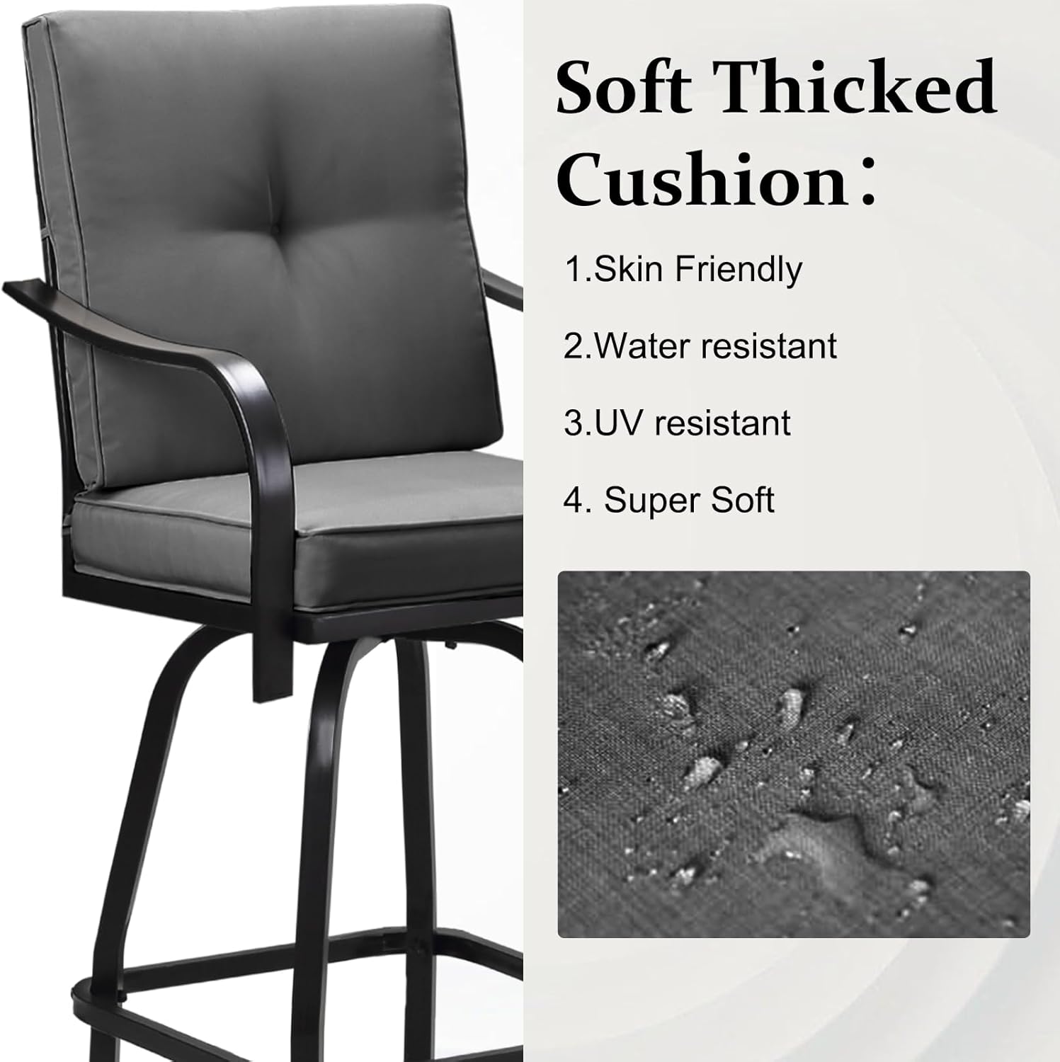 - Premium Material: the outdoor swivel Bar stools has a durable rust-resistant powder-coated Steel frame, The comfortable water-resistant cushions, makes it an ideal choice for outdoor living spaces, and has a high-quality steel frame, 2-Piece swivel set offers long-term durability
