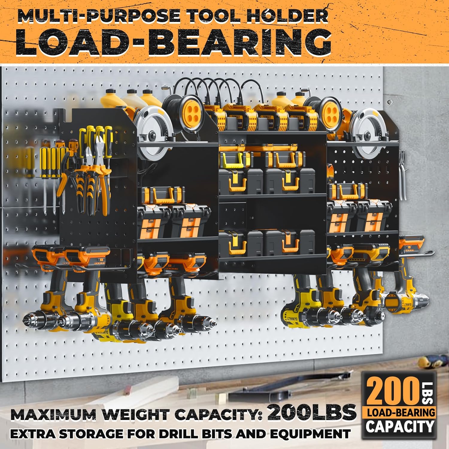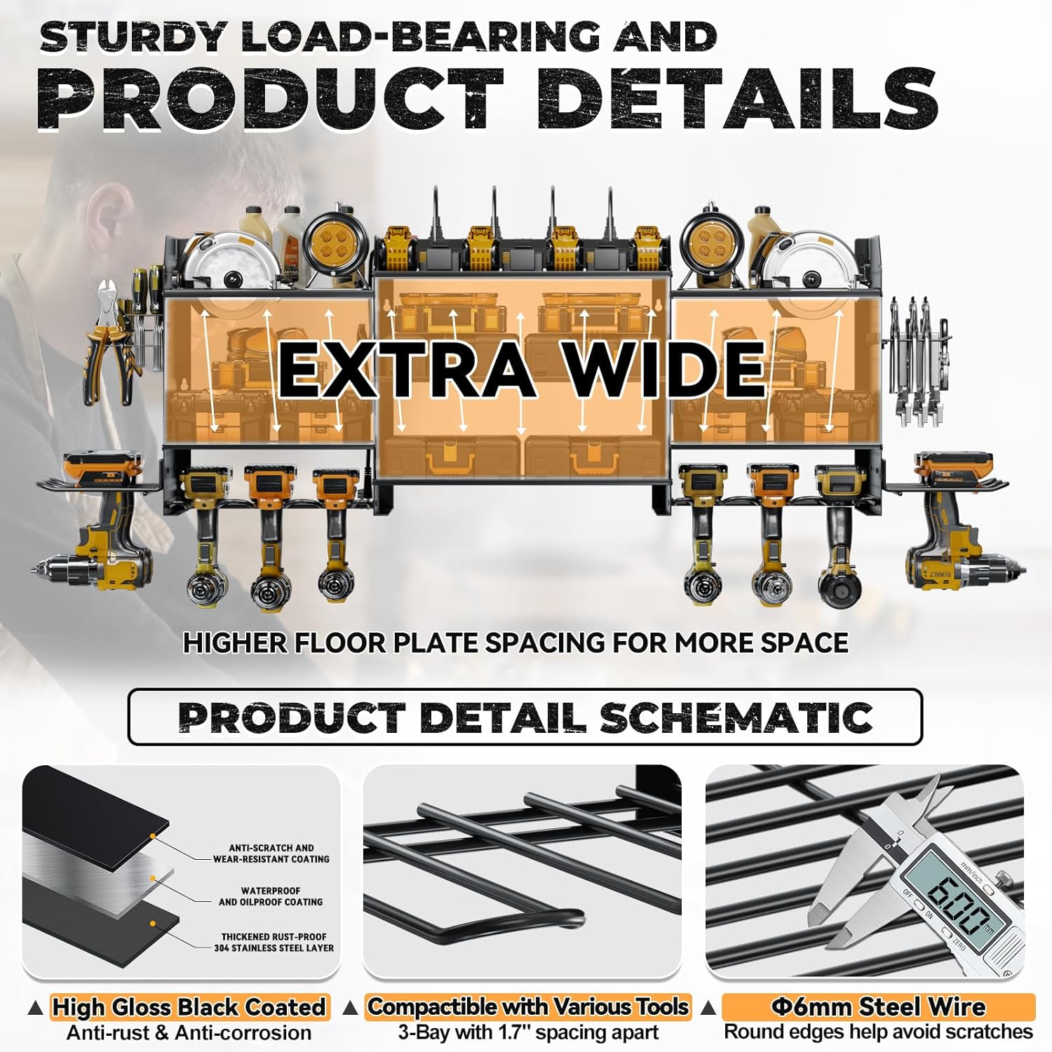 - [Perfect Garage Companion]Utilizing wall-mounted installation, this power tool rack maximizes unused wall space, saving time in tool retrieval. Ideal for garages, homes, workshops, sheds, backyard shops, and more, it offers suspended tool organization and storage.