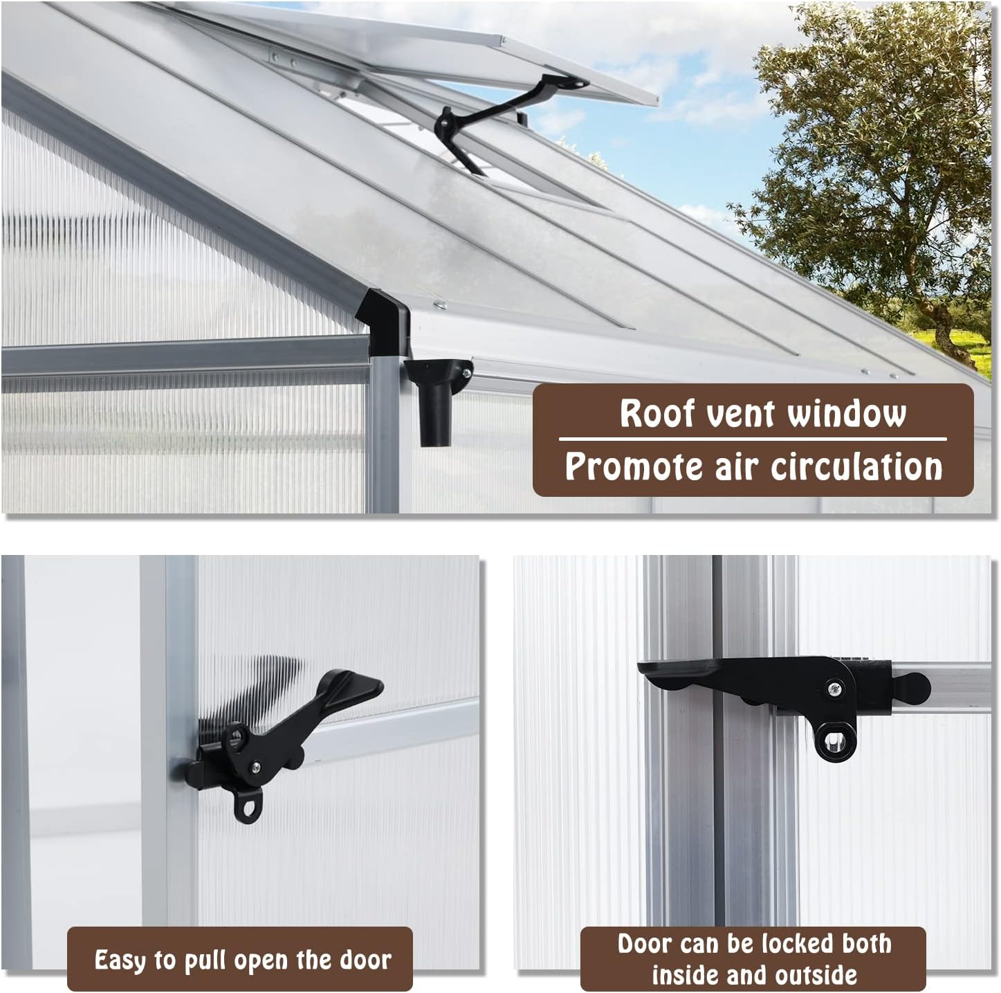 - Vent & Lockable Door - The top vents can be opened at the desired height for ventilation. The doors can be opened or locked both inside and outside. This not only keeps you cool while working in this walk-in greenhouse, but also ensures that your plants get all the fresh air they need to promote air circulation.