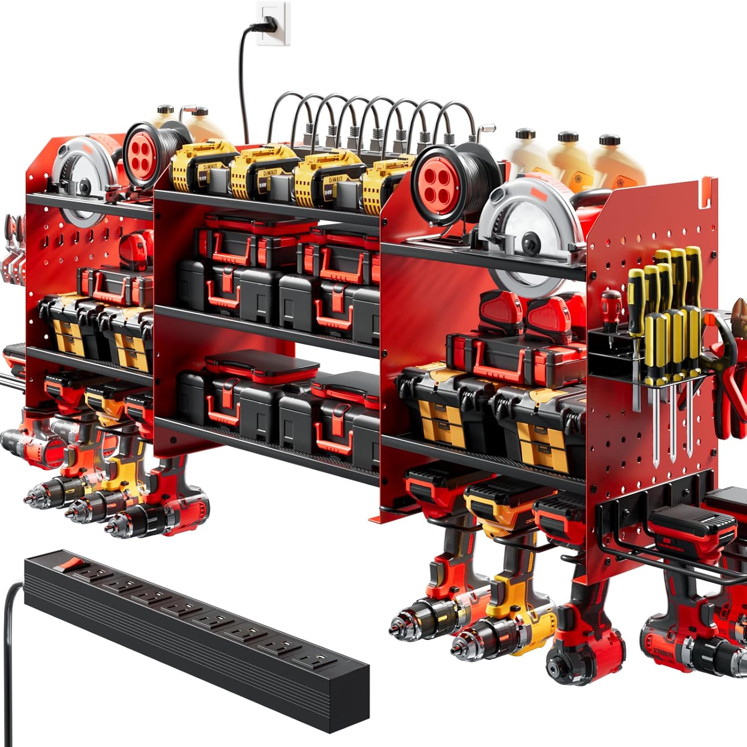 - [High-Capacity Storage]Wall mount power tools organizer features 10 drill holder, alongside a built-in power strip. Its double layer structure keeps rechargeable tools organized in the work area, saving bench space. Notably, the spacing between the middle tiers is significantly larger than typical market offerings.