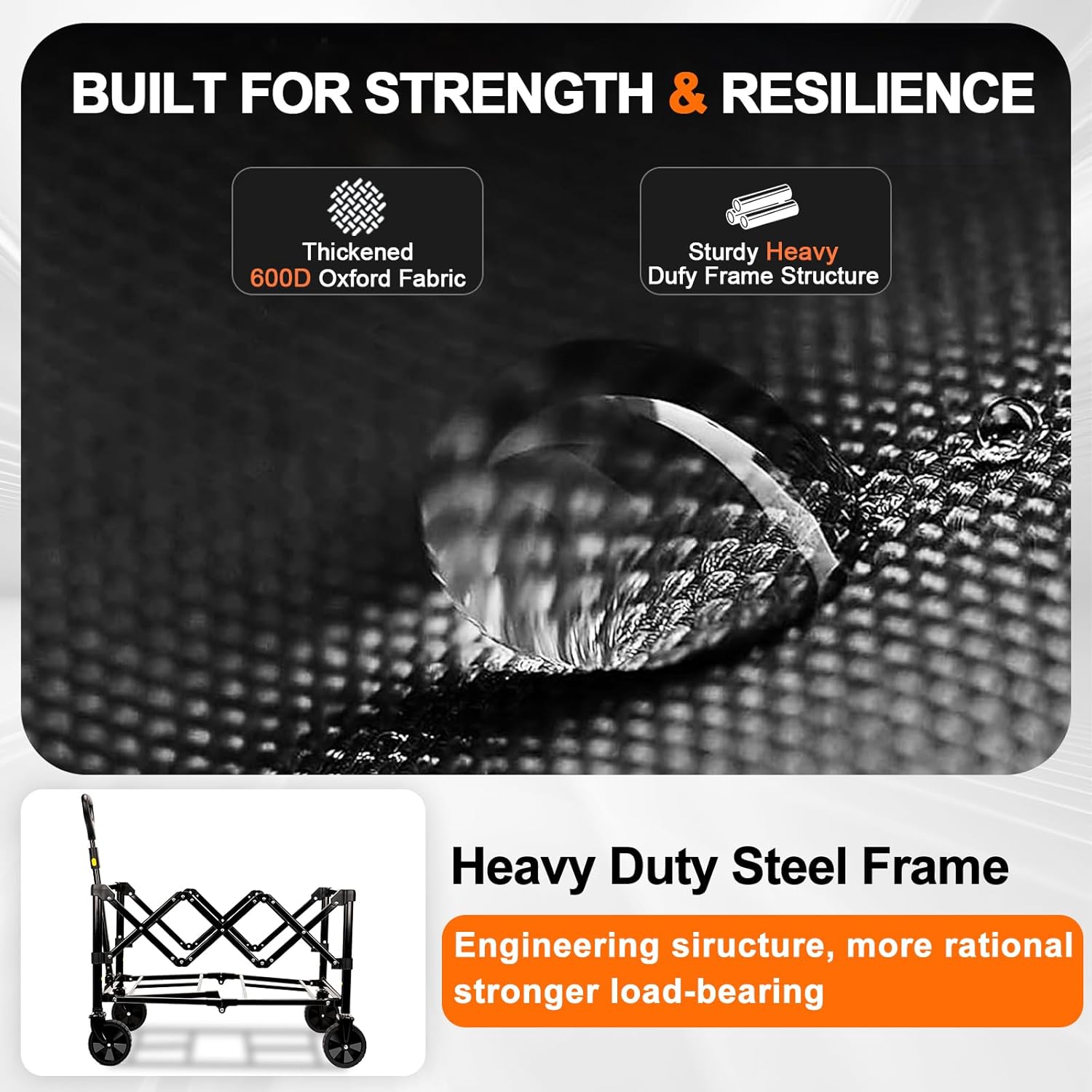 - LARGE CAPACITY - DURABLE COLLAPSIBLE WAGON: The collapsible wagon has an expansion size of 26.1"x 16.9"x 36.6" (L*W*H) and load up to 220LBS, which can carry all the goods your family needs for outdoor camping. The wagon body is made of lightweight aluminum alloy, compared to other products, our product is lightweight and strong, with anti-corrosion coating on the surface, which can prevent the body from rusting. Waterproof fabric, waterproof and durable, tear resistant, removable and washable