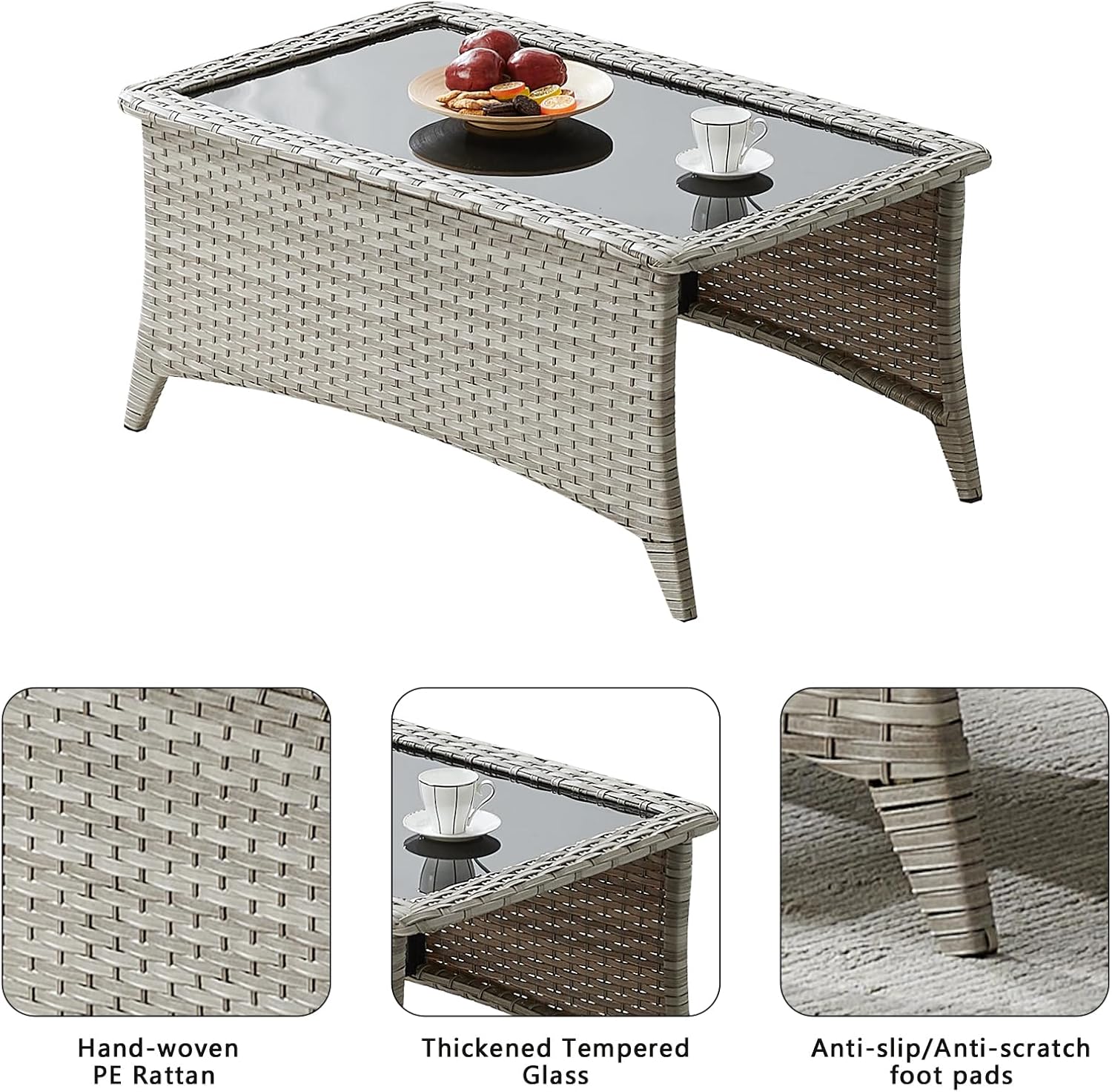 Patio Tables Wicker Coffee Table - Outdoor Rattan Coffee Tables with Glass Top for Patio Proch Deck Balcony Rectangle Light Grey