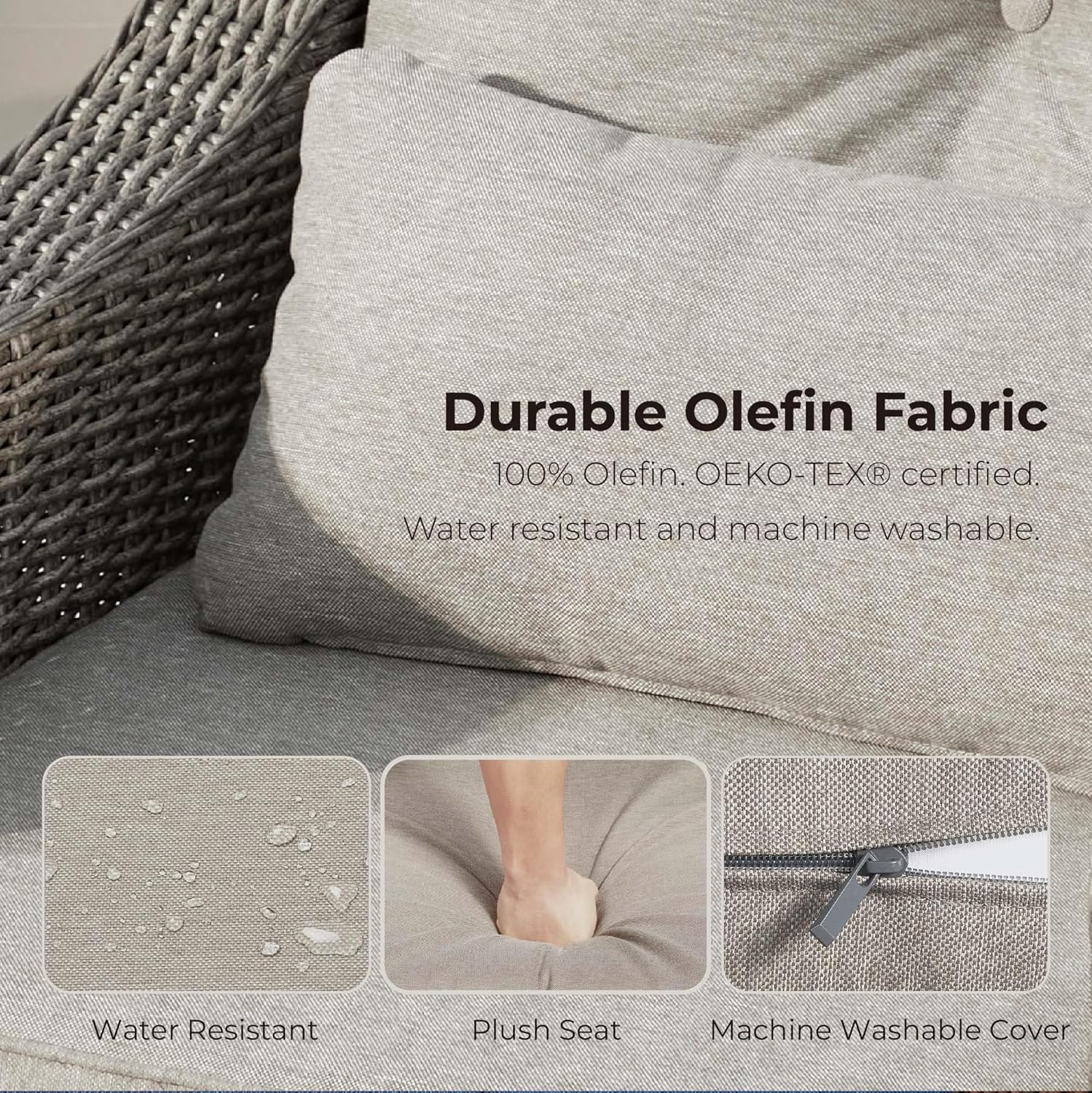 - Easy to Clean: The water-resistant 100% Olefin cushion covers are easy to maintain. Simply spot-clean with mild soap and water for regular care, or machine wash on a cold cycle for deeper cleaning. For protection during harsh weather, store the cushions under cover temporarily. Note: The product’s color may vary under different lighting conditions. For accurate color representation, always refer to the actual product.