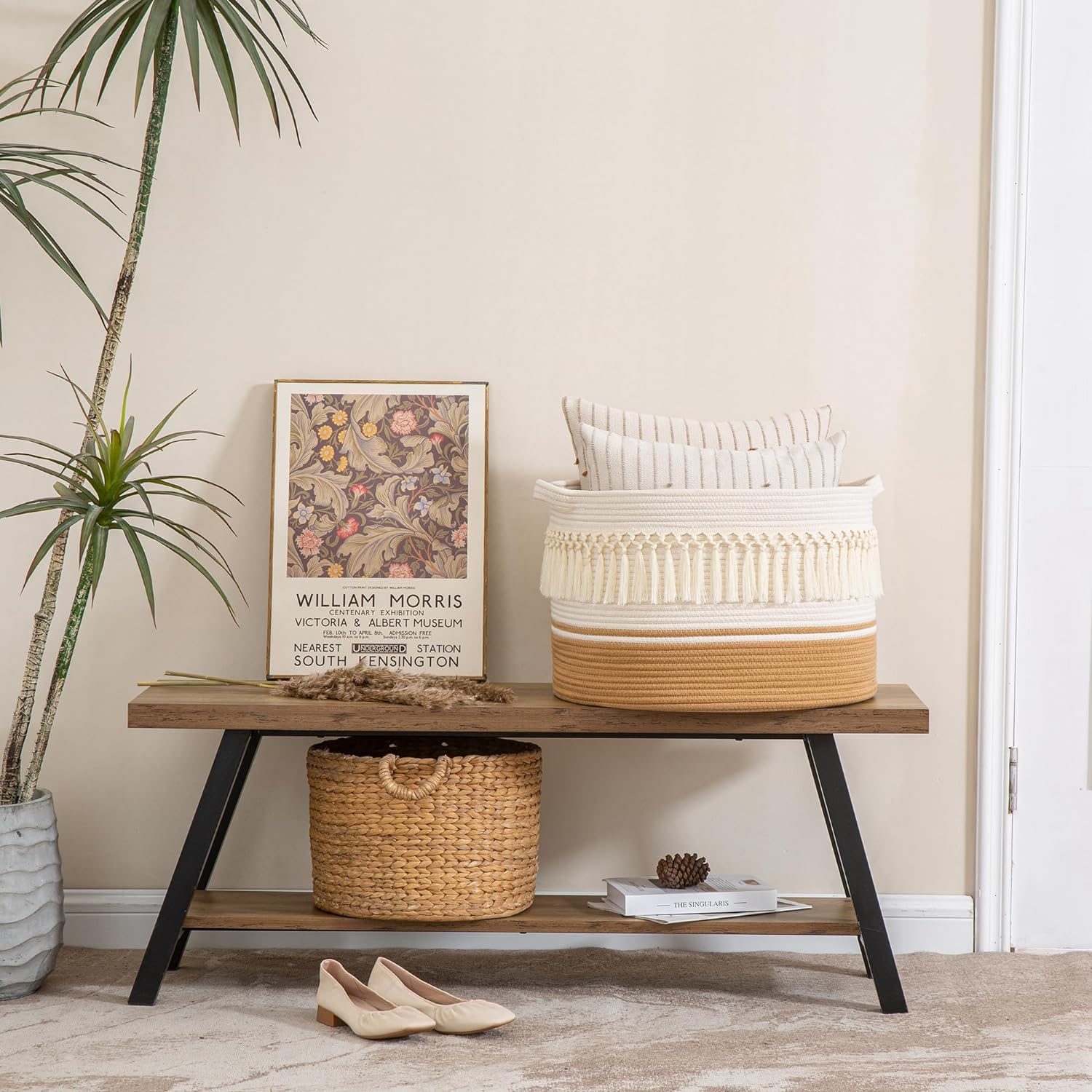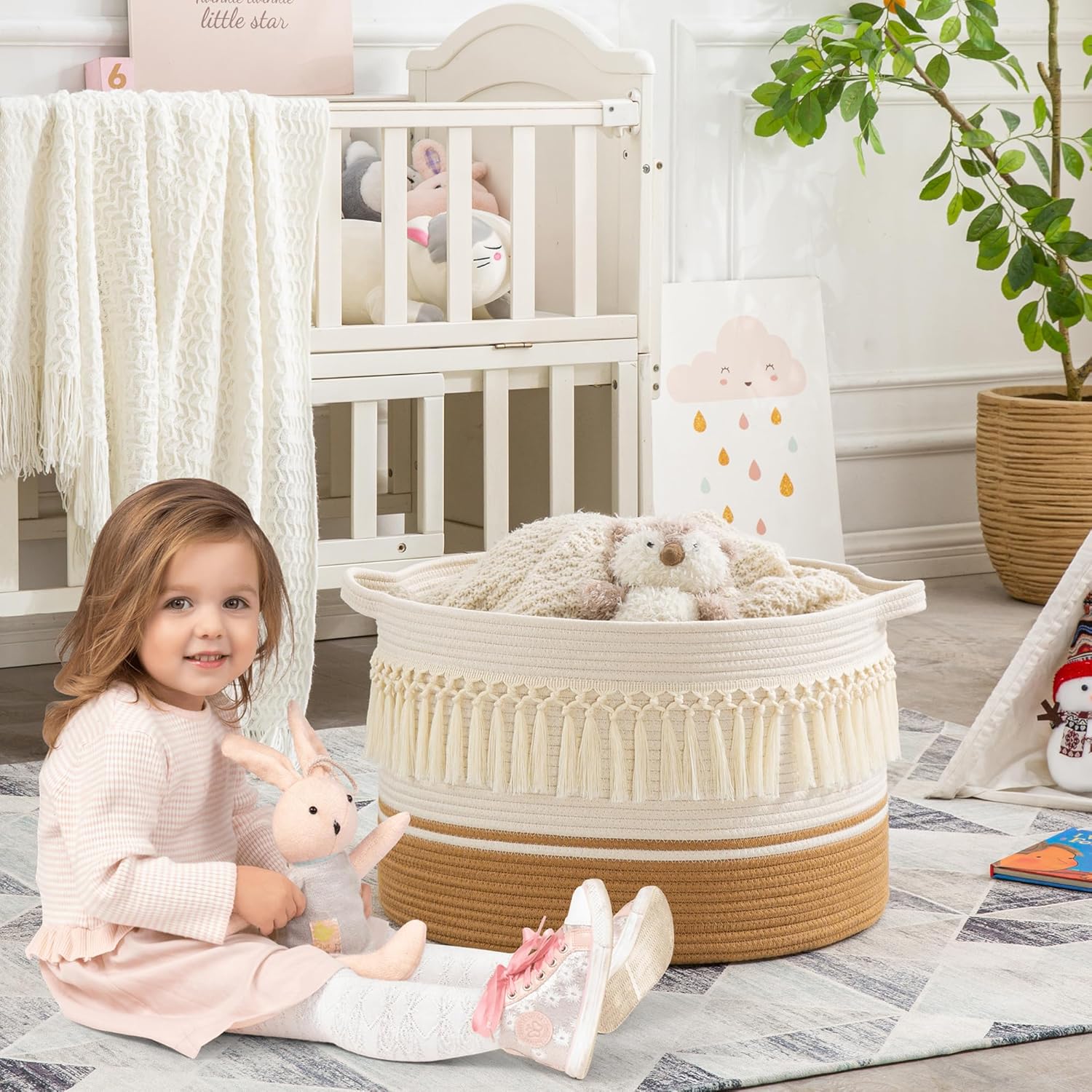 KAKAMAY Large Blanket Basket (20"x13"),Woven Baskets for storage Baby Laundry Hamper, Cotton Rope Blanket Basket for Living Room, Laundry, Nursery, Pillows, Baby Toy chest (White Fringe)