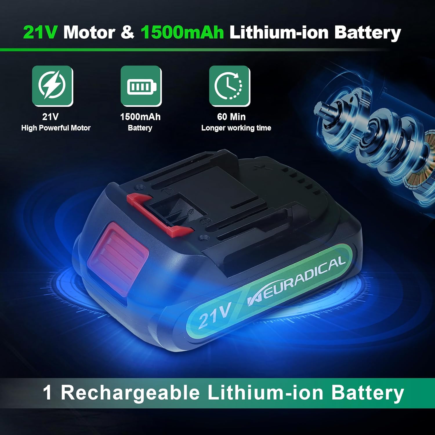 - 【Rechargeable Battery】 Neuradical hand held hedge trimmer cordless is powered by rechargeable & detachable lithium battery (21V 1500mAh).It offers approximately 60 minutes of working time. The Neuradical cordless grass shear & shrubbery trimmer has enough power to complete your gardening/pruning task.