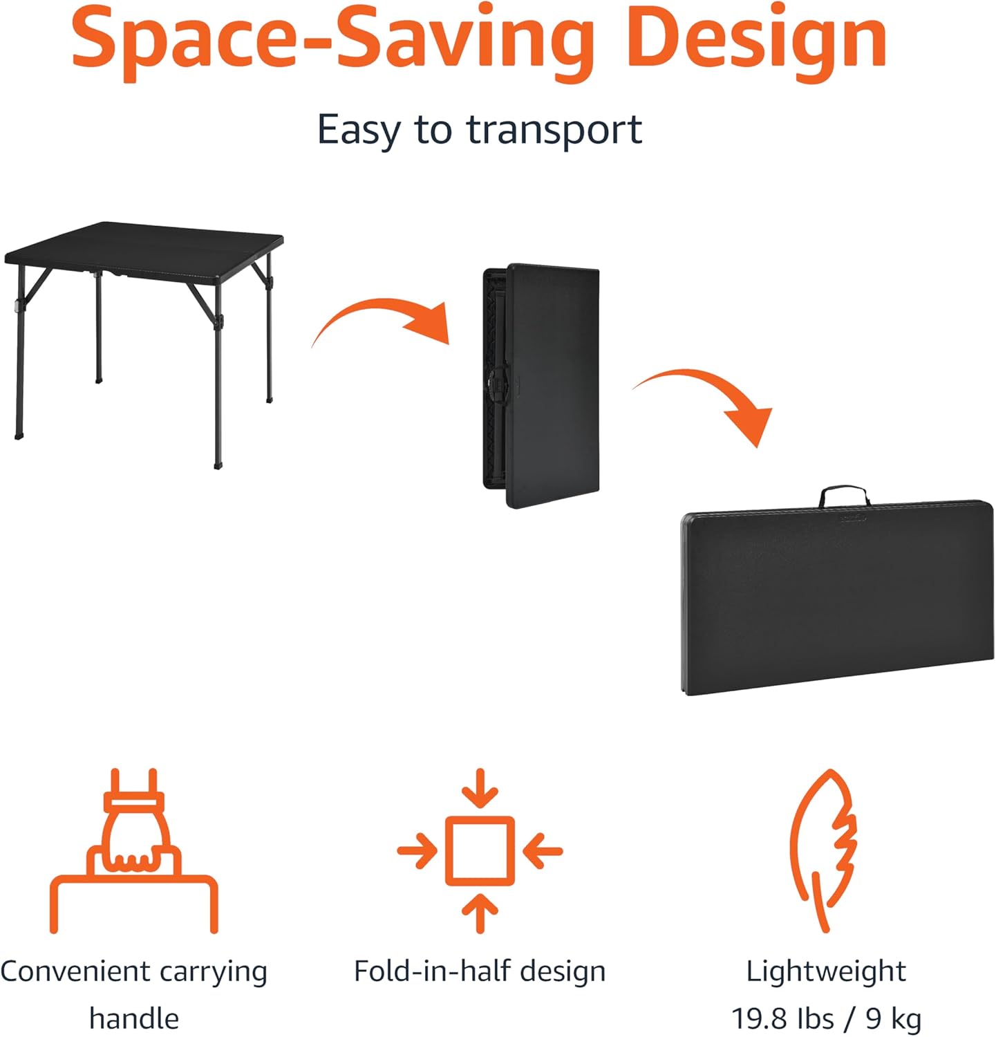 - 34-inch lightweight folding table with easy-transport carrying handle