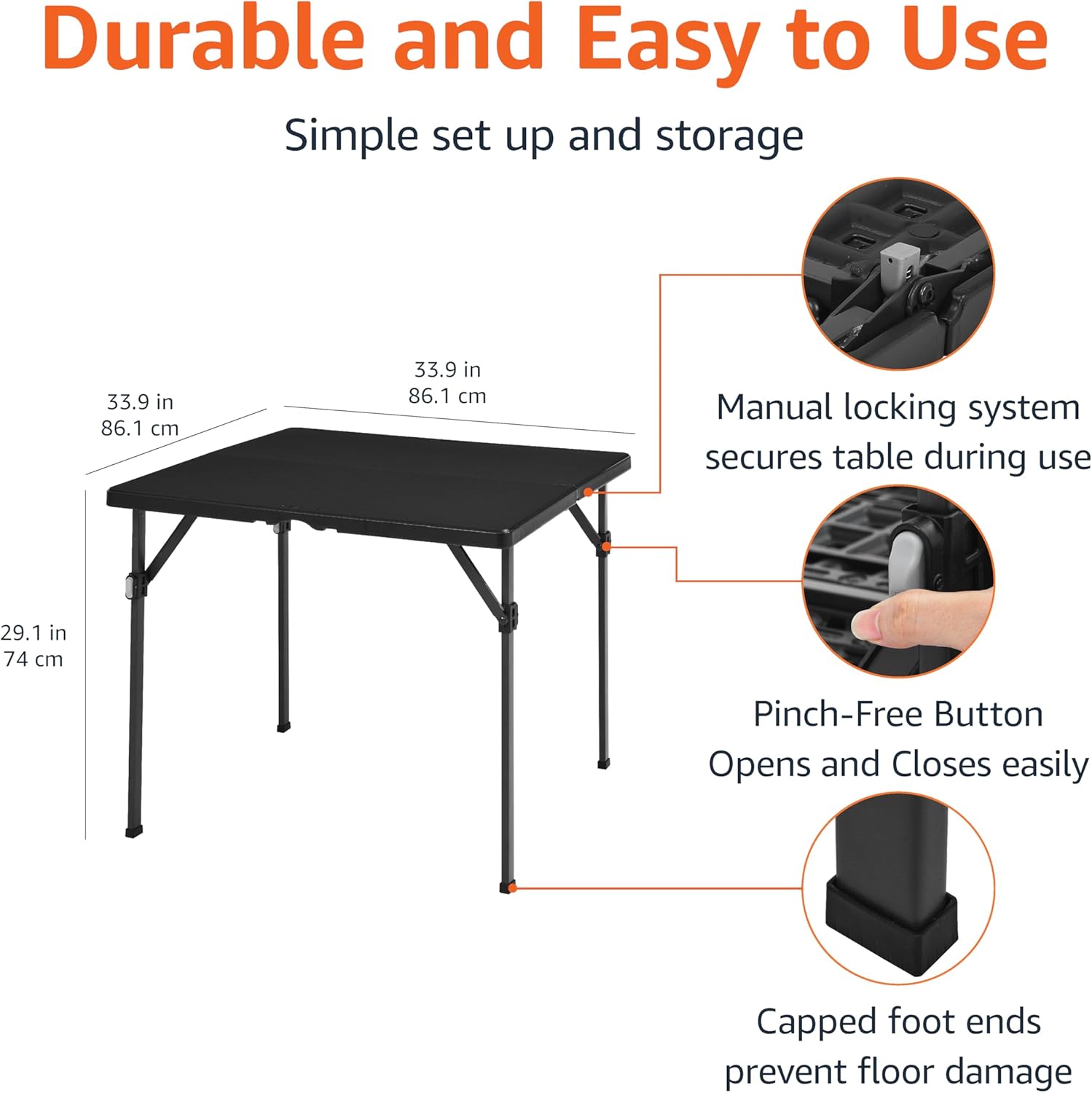 Amazon Basics 34 inch Portable Folding Dining Table with Carrying Handle, Black, 33.9 x 29.1 x 33.9 inch, Square