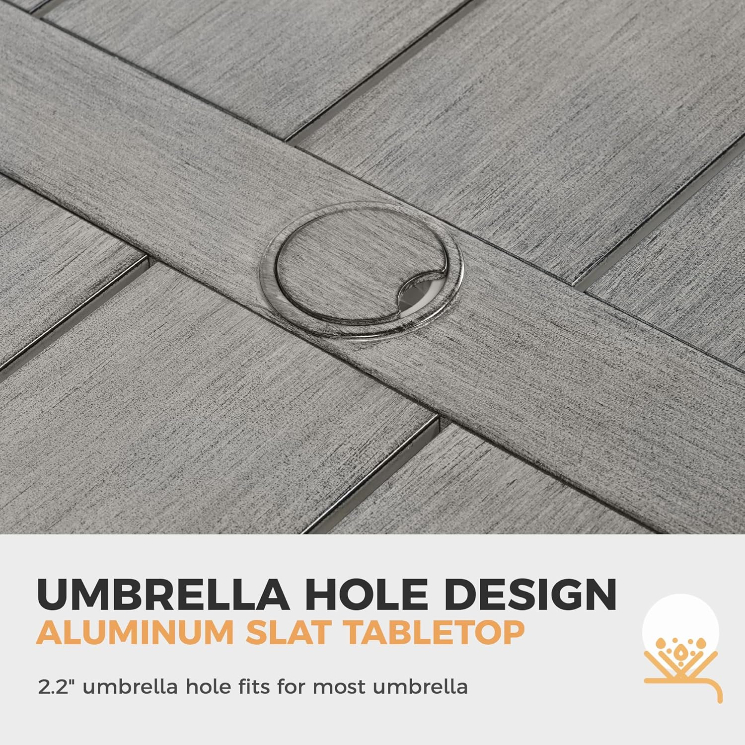 - 2.2" Umbrella Hole Design: The outdoor dining table features a 2.2" umbrella hole integrated into the tabletop, providing shade on sunny days or protection from heavy rain. This can be especially useful for outdoor dining or gatherings, allowing you to enjoy your time outside without being affected by the weather.