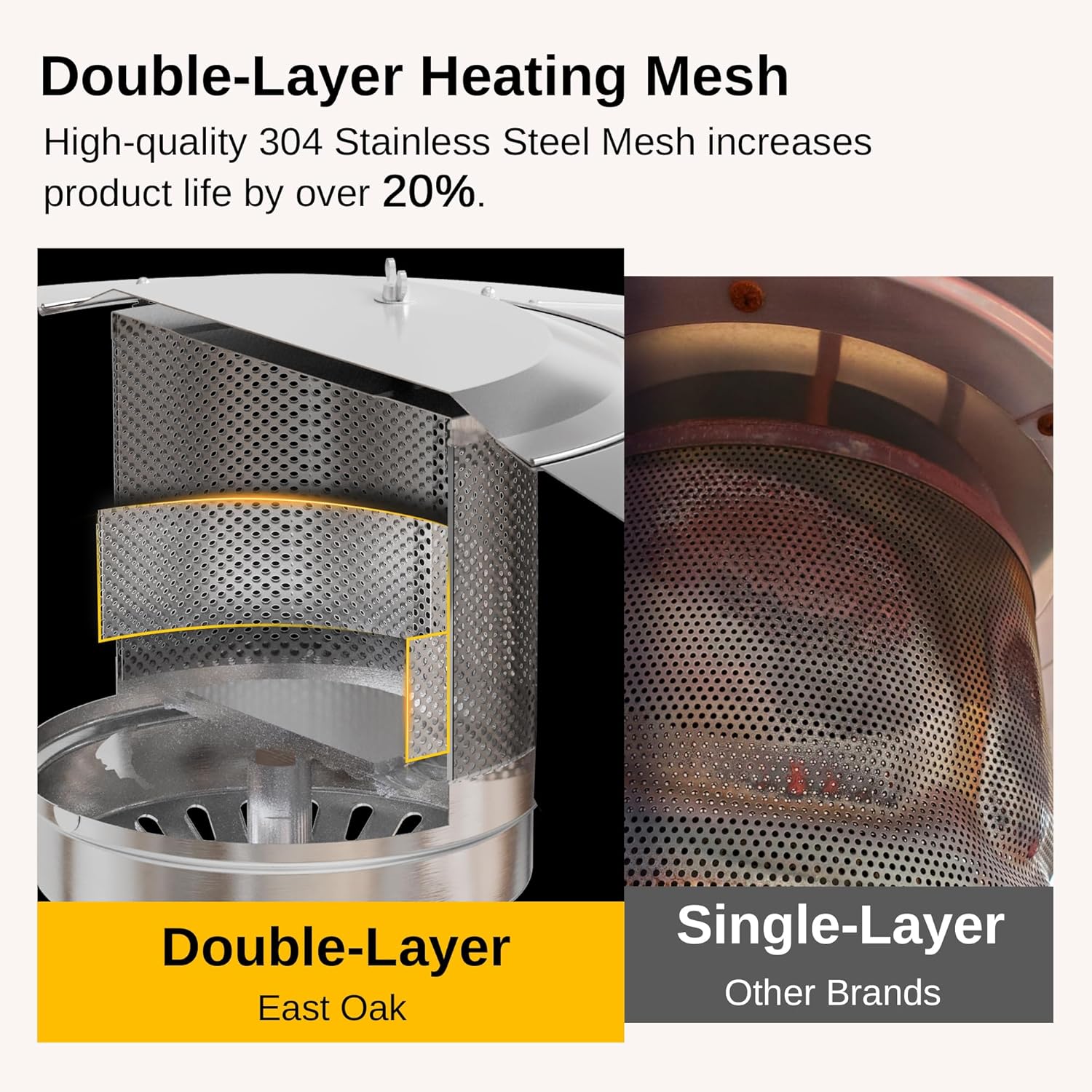 - 𝗠𝗼𝗿𝗲 𝗗𝘂𝗿𝗮𝗯𝗹𝗲 𝗗𝗼𝘂𝗯𝗹𝗲-L𝗮𝘆𝗲𝗿 𝗛𝗲𝗮𝘁𝗶𝗻𝗴 𝗠𝗲𝘀𝗵: High-quality 304 stainless steel is engineered into our double-cover heating mesh design. Compared with a traditional single-layer burning mesh heater, the EAST OAK Outdoor Heater is more powerful, durable, and safer. All these improvements deliver a 30% longer product life
