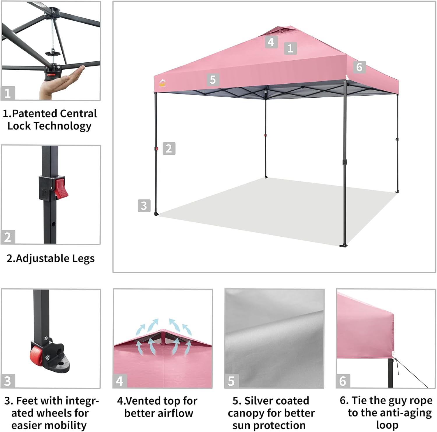 - ONE BUTTON EASY SET UP - Our 10x10 pop up canopy tent features patented one push center lock tech. With just a single push, the central hub locks the poles in place. Designed for the next generation, this outdoor canopy for patio can be set up by two people in seconds without any tools. Three adjustable height settings with soft, pinch-free buttons ensure convenience and safety, making it perfect for camping, beach outings, craft fairs, tailgating, farmer markets, outdoor BBQs, and more.