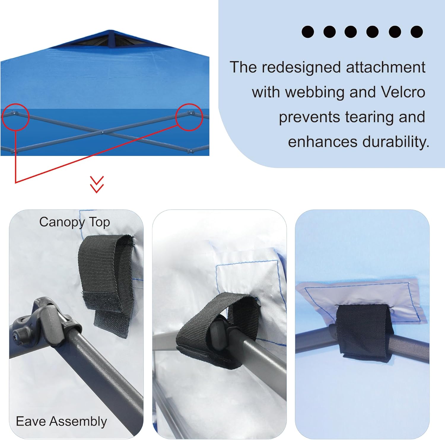 - HIGH GRADE STEEL FRAME - The durable, high-grade, corrosion-resistant steel truss frame with hardened through bolts comes pre-assembled and can be set up without any tools. Engineered to support up to 120 lbs. distributed across the frame, it ensures robust and reliable performance. The extended ceiling assembly and upgraded high peak design make it easier for rainwater to run off, preventing water pooling on the canopy. Perfect for extended outdoor use at markets, festivals, and exhibitions.