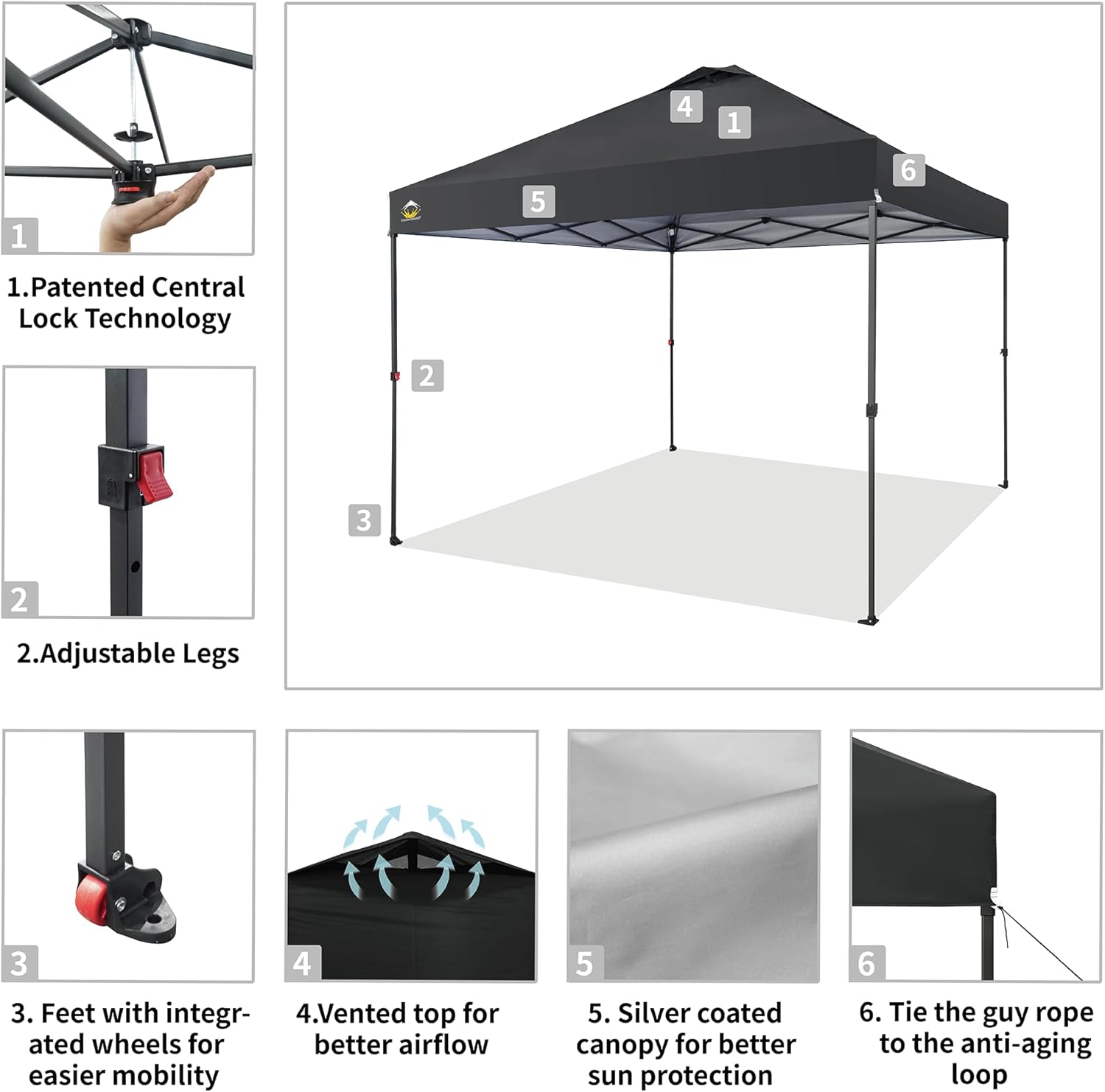 - ONE BUTTON EASY SET UP - Our 10x10 pop up canopy tent features patented one push center lock tech. With just a single push, the central hub locks the poles in place. Designed for the next generation, this outdoor canopy for patio can be set up by two people in seconds without any tools. Three adjustable height settings with soft, pinch-free buttons ensure convenience and safety, making it perfect for camping, beach outings, craft fairs, tailgating, farmer markets, outdoor BBQs, and more.